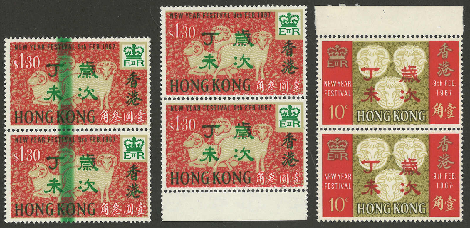 1967年羊年1角及1元3角直雙連共3件(楊目C44-45),展示了“1967”後多點等印刷變異。均為新。(Image 1)