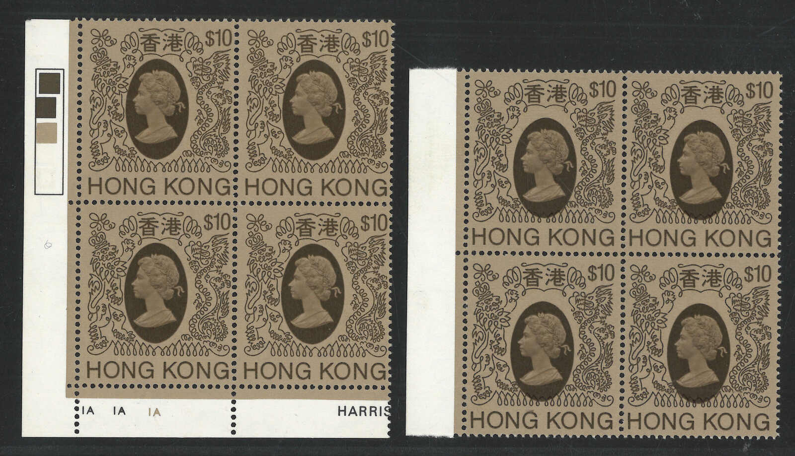 1982-1986 Hong Kong QEII 4th series $10 horizontal pair and block of 4 x3, all with portrait shifted variety. Plus a normal single for reference.