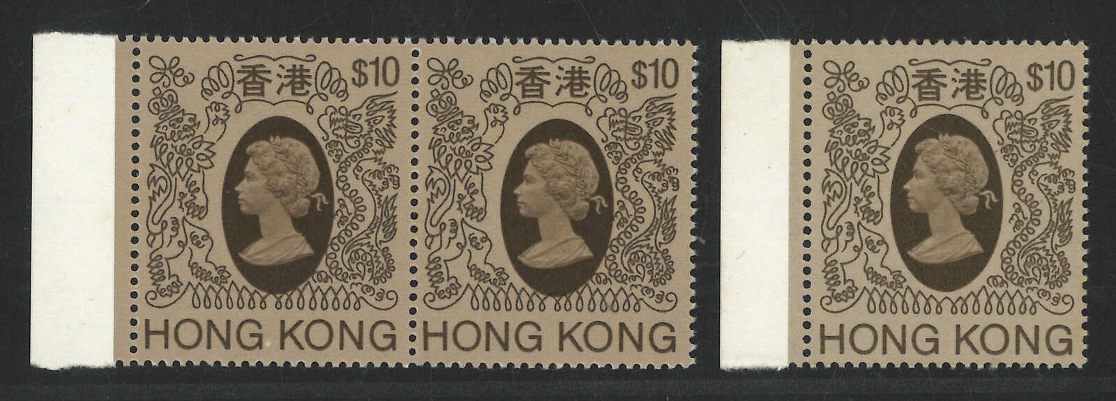 1982至1986年香港伊麗沙伯二世第四組10元橫雙連及四方連共三件新,帶肖像移位變異。另附一枚正常新票作對比。(Image 1)