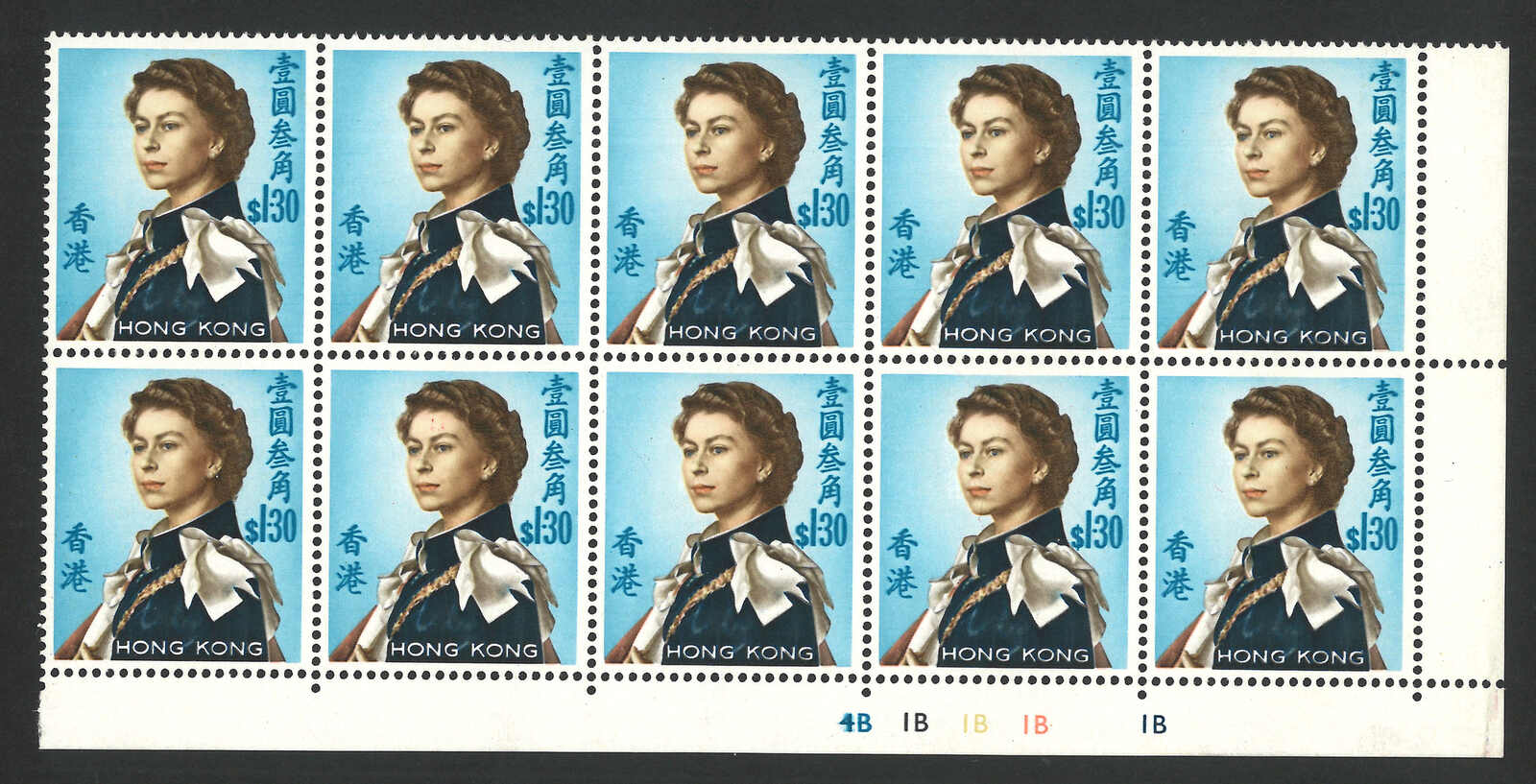 1970至1973年香港伊麗沙白二世第二組(軍裝圖)1元3角、2元及20元方連,分別展示了複印及套印移位變異。除20元均為新。(Image 1)