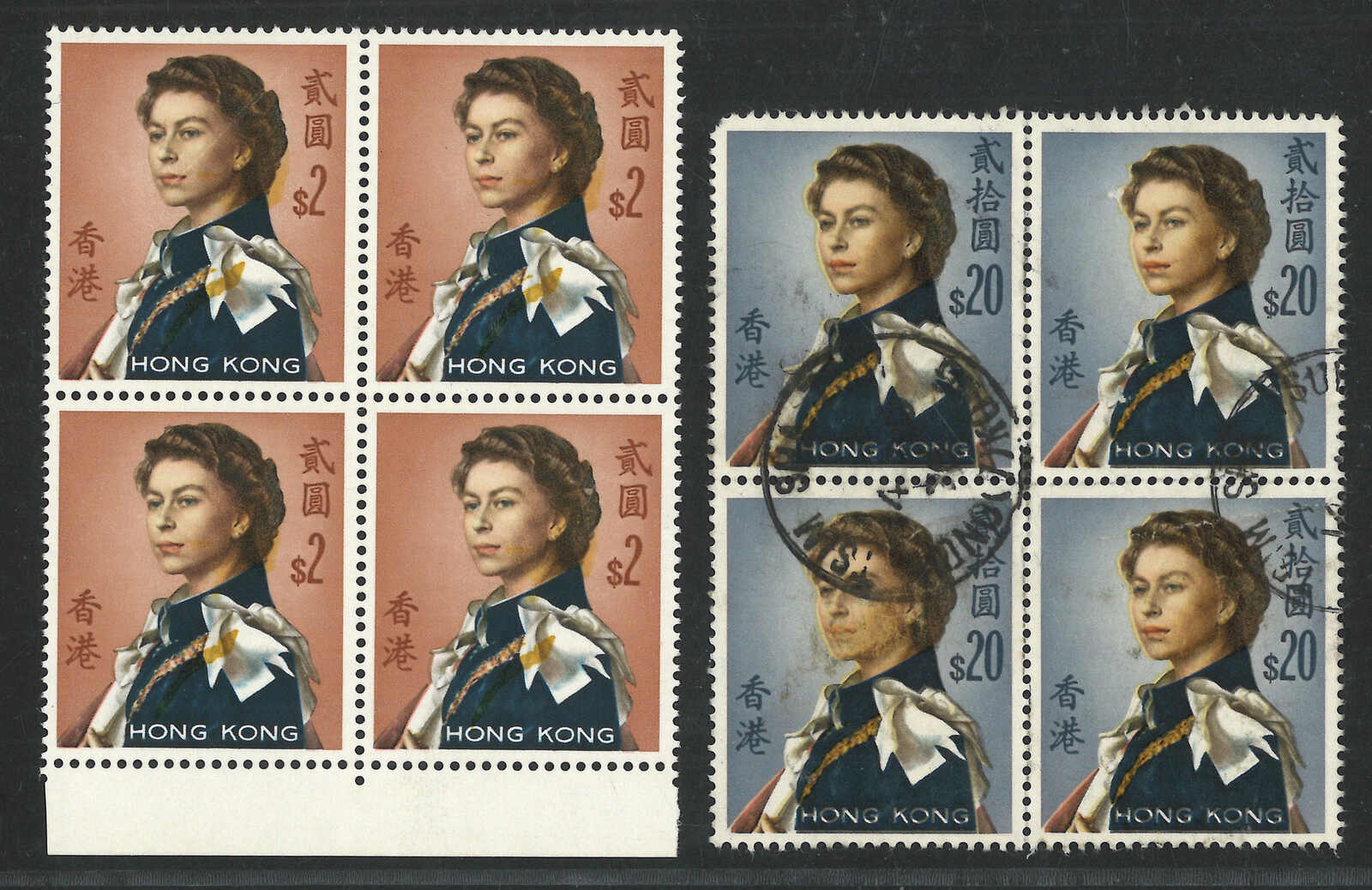 1970-1973 Hong Kong QEII 2nd series (Annigoni portrait) $1.3, $2 and $20 in multiples, showcasing double impression and colour shifted variety. $20 block used while other two mint.