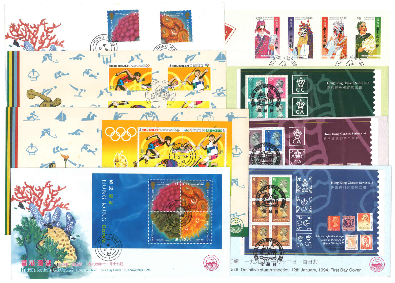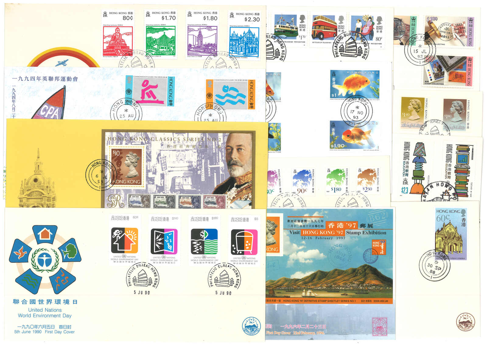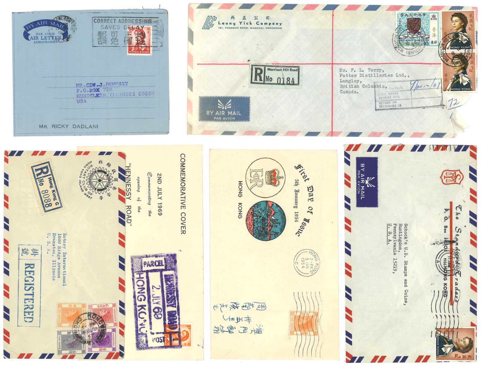 1950至1960年代一組十一件香港信封,大多貼伊麗莎白二世普票,當中包含航空郵簡及首日封。(Image 1)