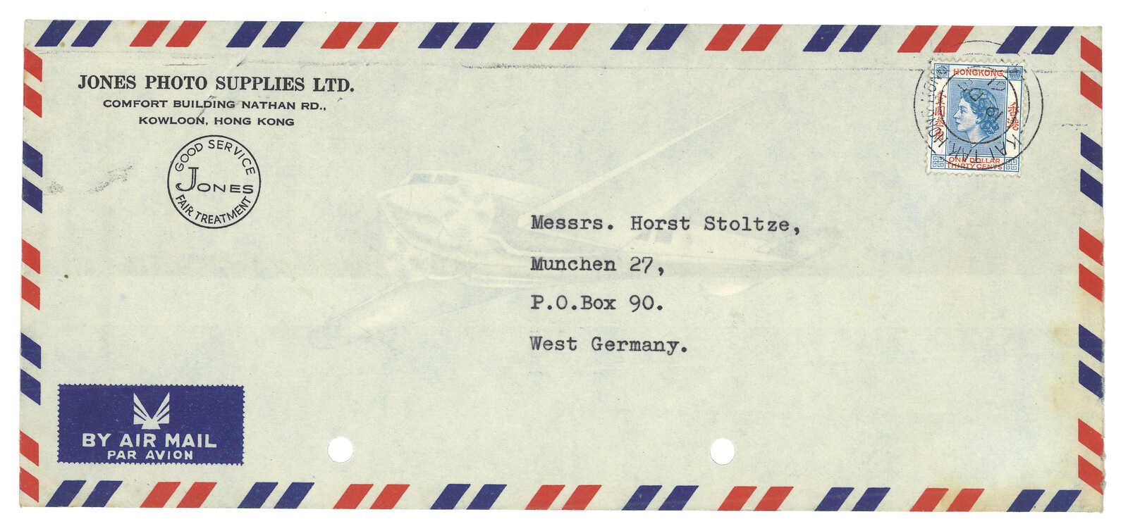 1961.12.19 啟德寄西德航空封,貼香港伊麗莎伯二世1元3角,銷極罕之啟德Proud D5型4字日戳。此戳未見於Webb的記錄中,同時此例日期比Proud的記錄更晚。W.R. Wellsted稱此為最稀罕的戰後香港郵戳。(Image 1)