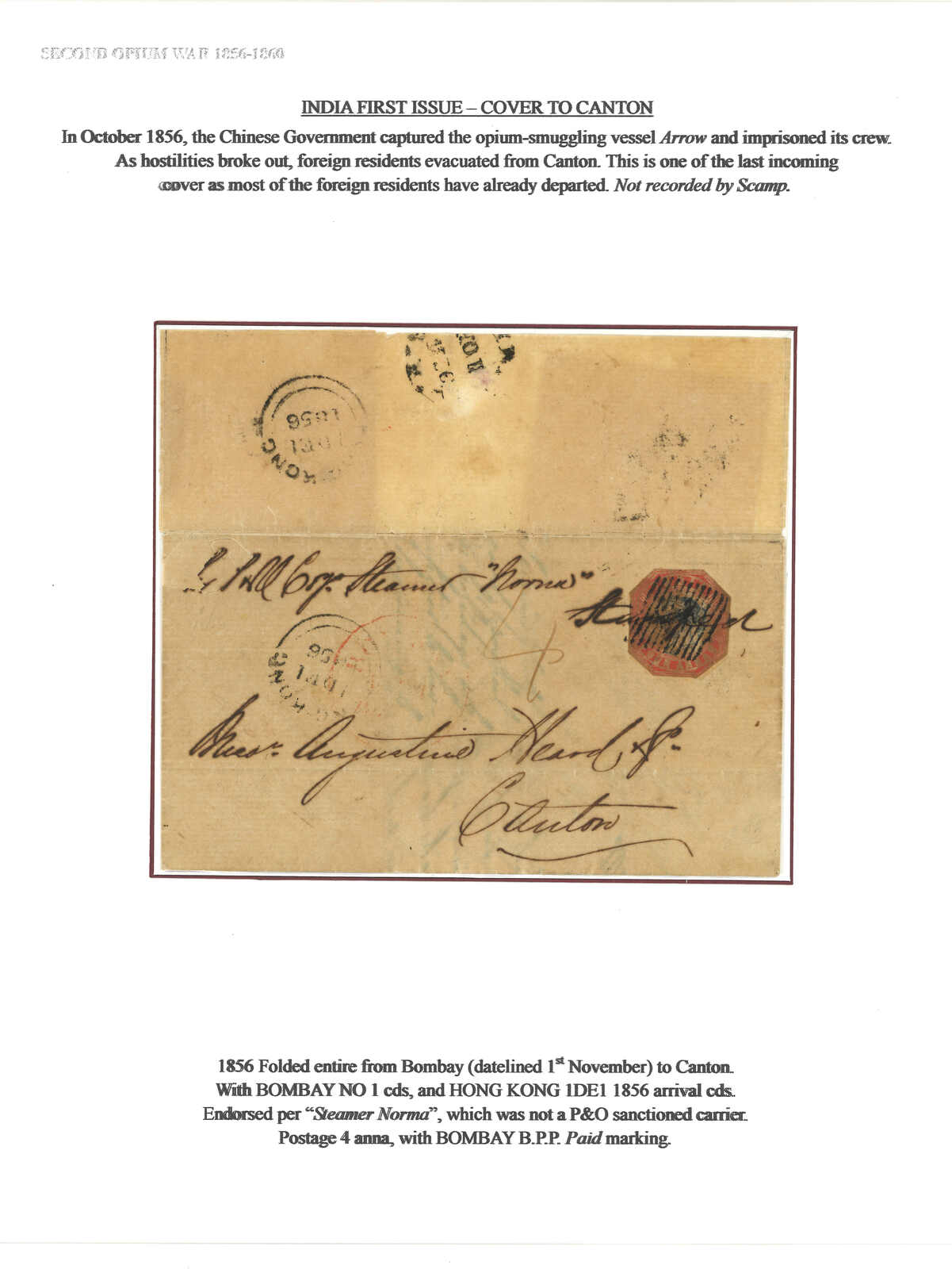 1856.11.1 孟買寄廣州瓊記洋行。郵簡,寫有“4”及“per Steamer Norma”批示,貼有珍罕之印度維多利亞女皇像4安娜八角形票,銷鑽石殺手戳,旁鈐孟買郵資已付戳。12.1經香港。Norma號未見Scamp之記錄。在第二次鴉片戰爭前夕,大多外國人已離開。故此為甚晚之進口封例。(Image 1) (Image 2)