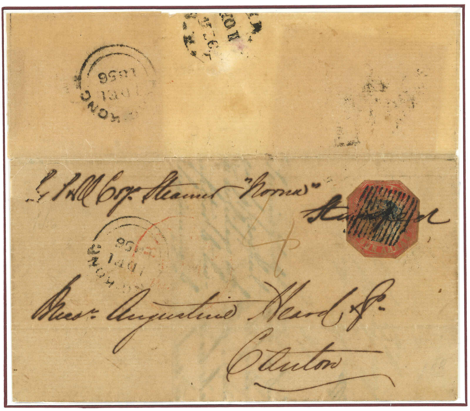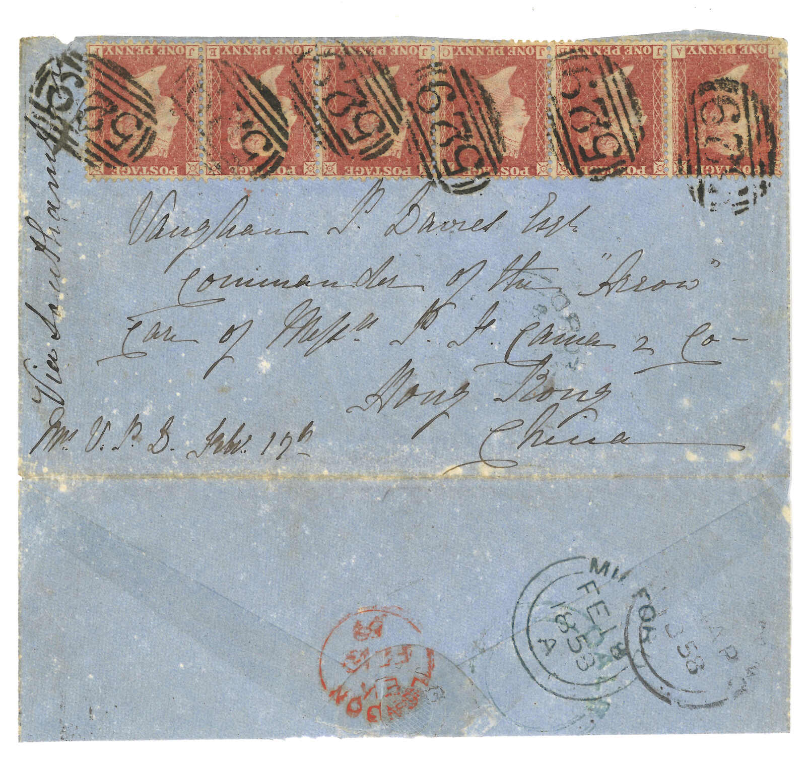 英國寄香港 - 轉交亞羅號海軍指揮官,經 Cawle & Co. 轉遞 1858年2月18日寄出,信封貼用維多利亞女王一便士紅色線雕郵票六枚,均銷以 「529」橫條數字格線銷戳。左上角手寫註明「Via Southampton」鄭路。信件地址為: 中國香港轉交 P.H. Cawle & Co., 「亞羅號」艦長Vaughan T. Daves 閣下。Cawle & Co. 為十九世紀中期駐香港的英資轉運代理商,專責接收、暫存或再轉遞海軍及商業信函,予派駐華之外籍居民與軍官。信封背面蓋有:香港雙圈日戳(1858年4月4日);英國MILFORD 日戳(1858年2 月18日);倫敦紅色發信日戳(1858年2月19日)。本件郵品收件人為Vaughan T. Daves 艦長,當時為英國皇家海軍亞羅號艦 HMS Arrow 指揮官。HMS Arrow 於1856年10月在廣州引發著名的「亞羅號事件」,成為第二次鴉片戰爭爆發的導火線,歷史意義重大。(Image 1) (Image 2)