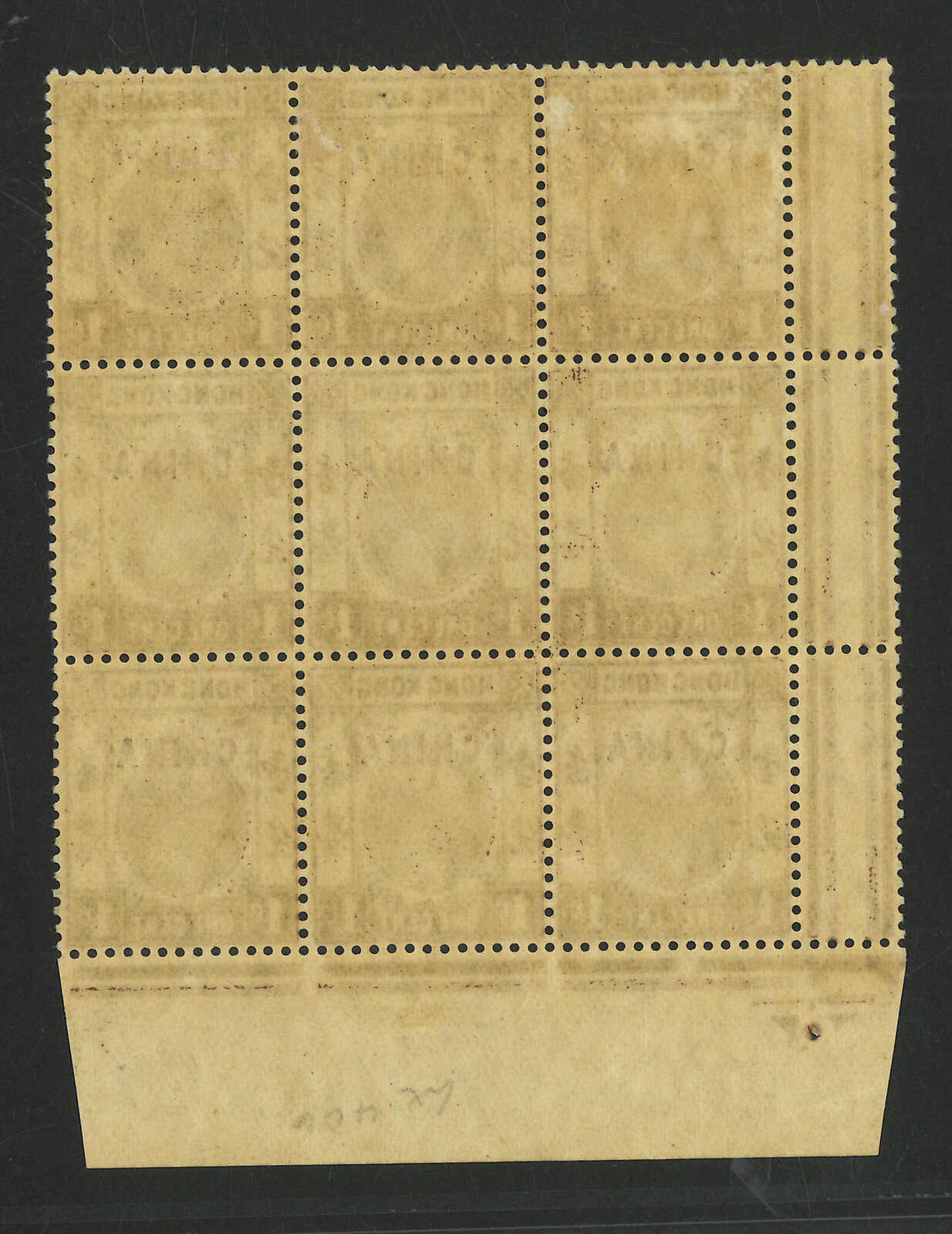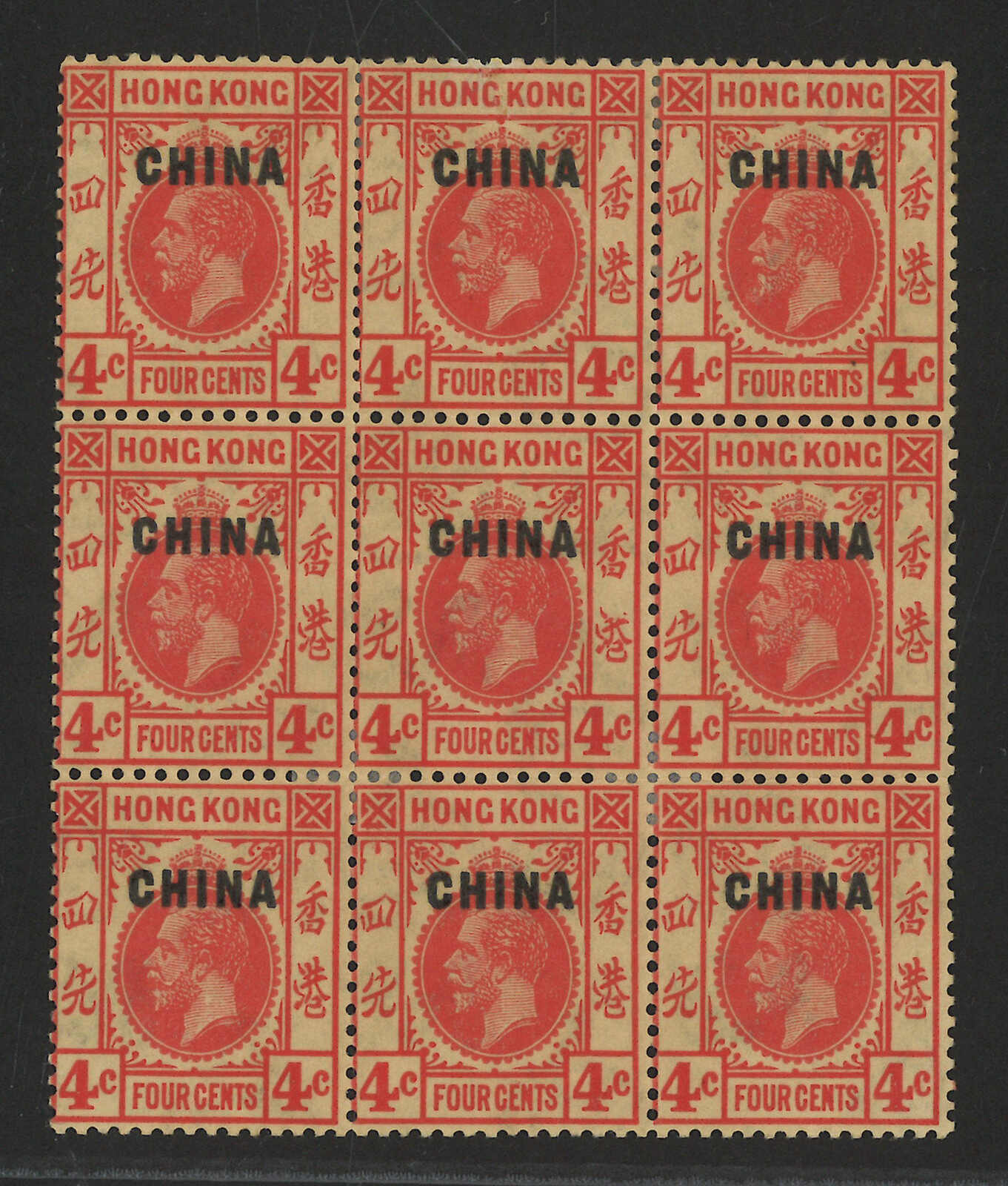 2344 **/bof image1917-1921 Hong Kong KGV ovpt. CHINA 1st issue wmk multiple crown CA block of 4 set, denominations inclde 1c, 2c, 4c, 6c, 8c, 10c, 20c, 25c and 50c. MNH.