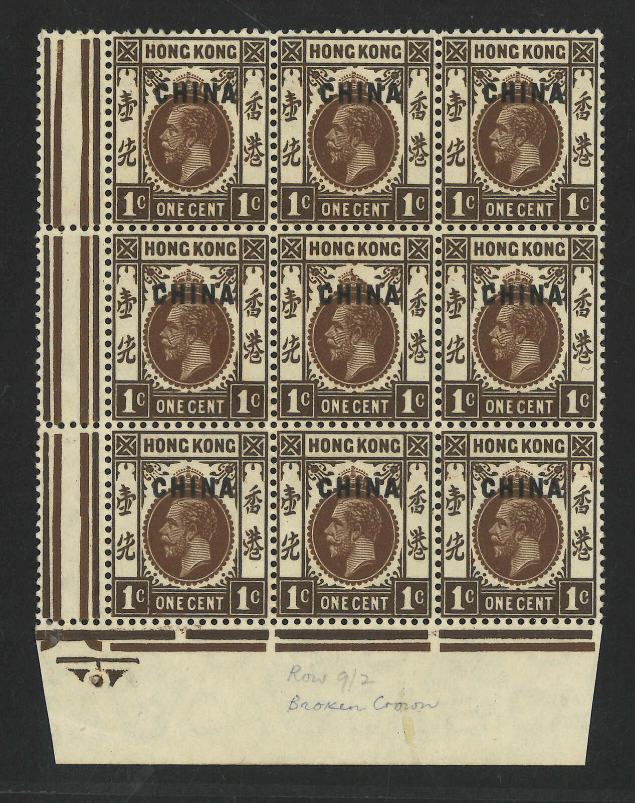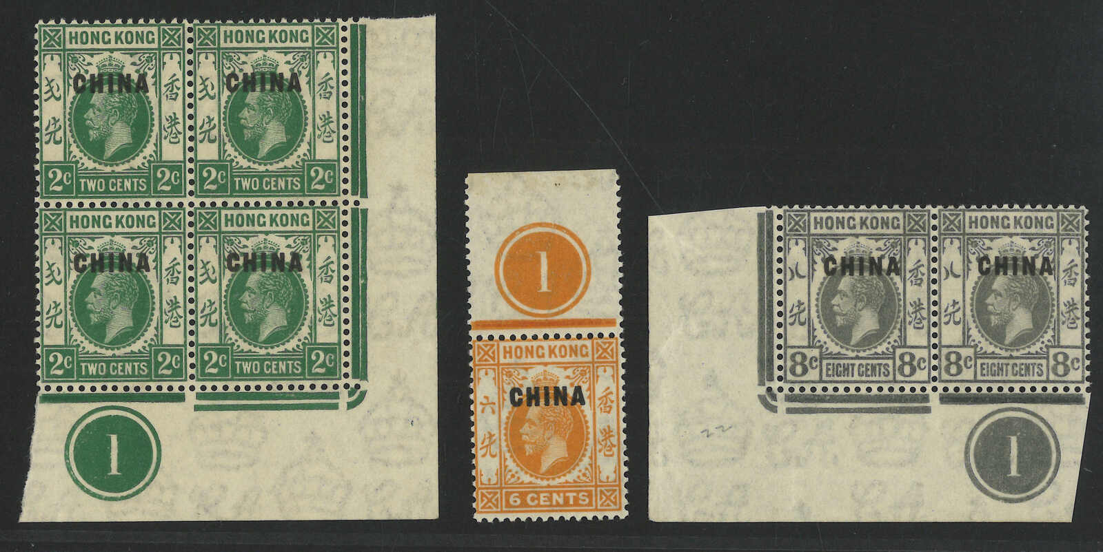 1917至1921年香港佐治五世加蓋CHINA第一組方連共5件,由1仙至50仙。當中1仙帶爛皇冠變異。均為新。(Image 1) (Image 2) (Image 3)