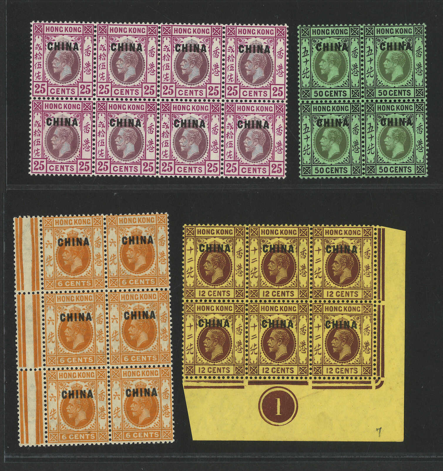 2346 */bof image1917-1921 Hong Kong KGV ovpt. CHINA 1st issue multiples in a group of 5, from 1c to 50c. 1c block with broken crown variety. All mint.