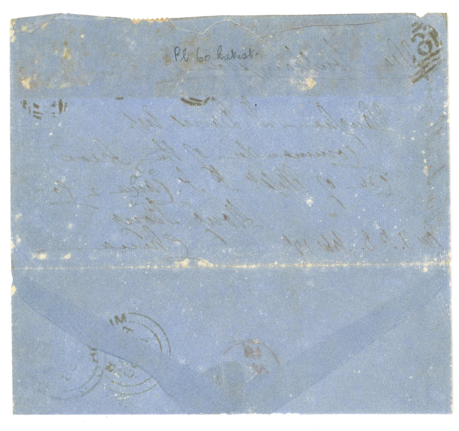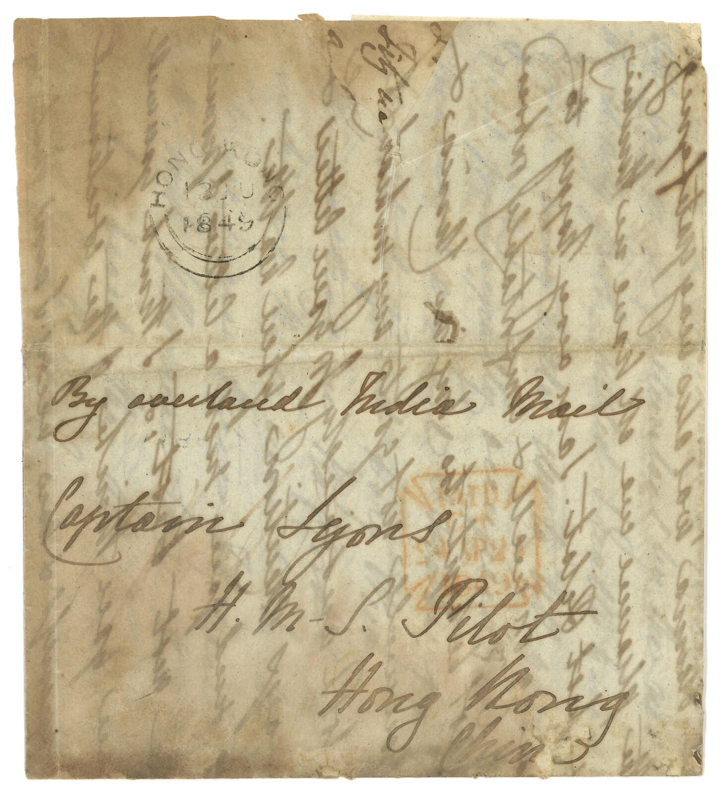1849.4.24 英國寄香港之英軍軍艦Pilot號Capt. Lyons,寫有“By overland India Mail”,鈐倫敦已付始發日戳及6.13香港 雙弧到達戳。附謄寫內容,大致有關皇家海軍在粵港一帶之活動。(Image 1)