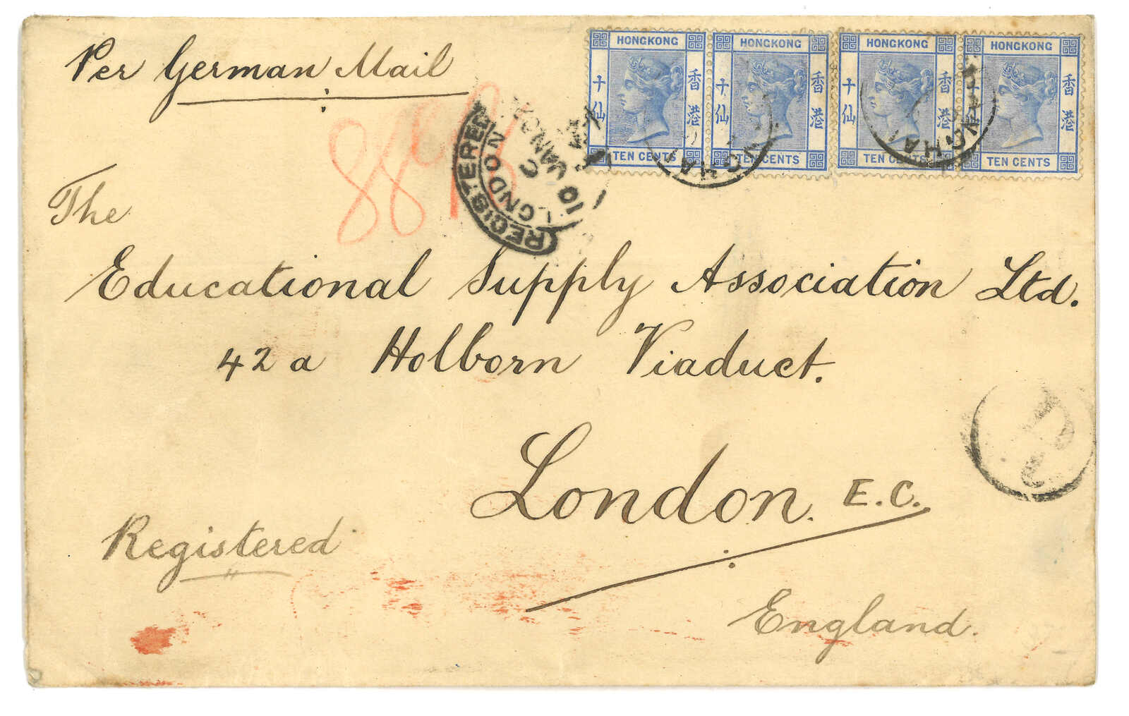 1902年上海寄英國。掛號封,貼香港維多利亞女皇像10仙橫四連,銷上海英局日戳。寫有“Per German Mail”。1.10抵倫敦。(Image 1) (Image 2)