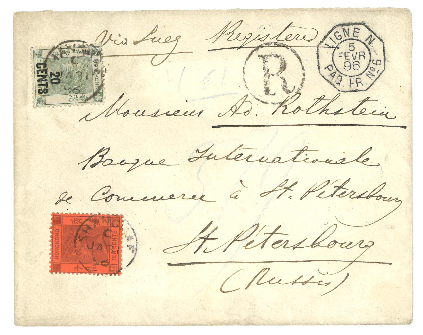 1896.1.31 上海寄俄國掛號封,貼香港票20仙 + 10仙,銷上海英局日戳。經法國郵船N線6號送遞。經法國郵船寄俄國少見。(Image 1) (Image 2)