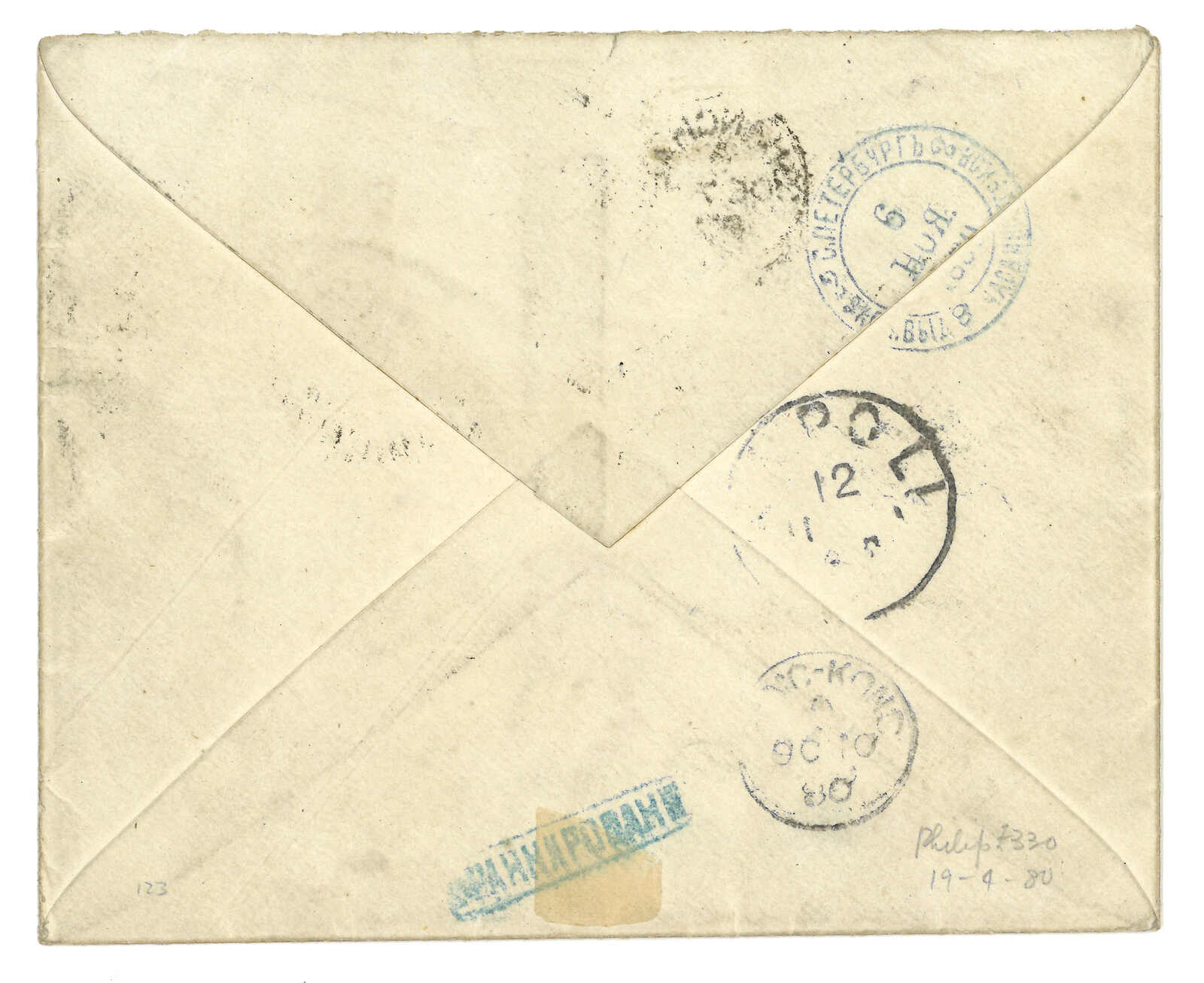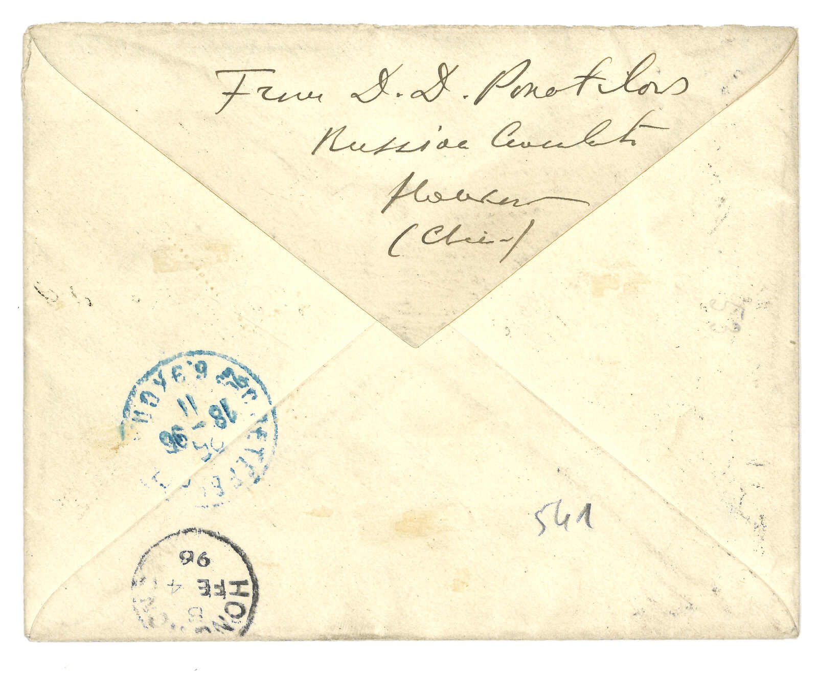 2028 cover image1896 (31 Jan) a registered envelope from Shanghai to St. Petersburg, Russia, franked with HK QV 20c ovpt. 30c green, and 10c brown red, both tied by SHANGHAI B.P.O. c.d.s. index C (31 Jan 96), Shanghai registered mark circled “R”, octagonal “LIGNE N PAQ. FR. No.6 / FEVR 96” d.s. On the reverse side, Russie arrival c.d.s (26 Nov 96), HK transit c.d.s. (4/II//96 – that is Russian Julian date system, translating into our international date as 9 March 1896). An excellent French mail to a rare destination of St. Petersburg, Russia via French LIGNE N Paquebot No.6. A rare mail.