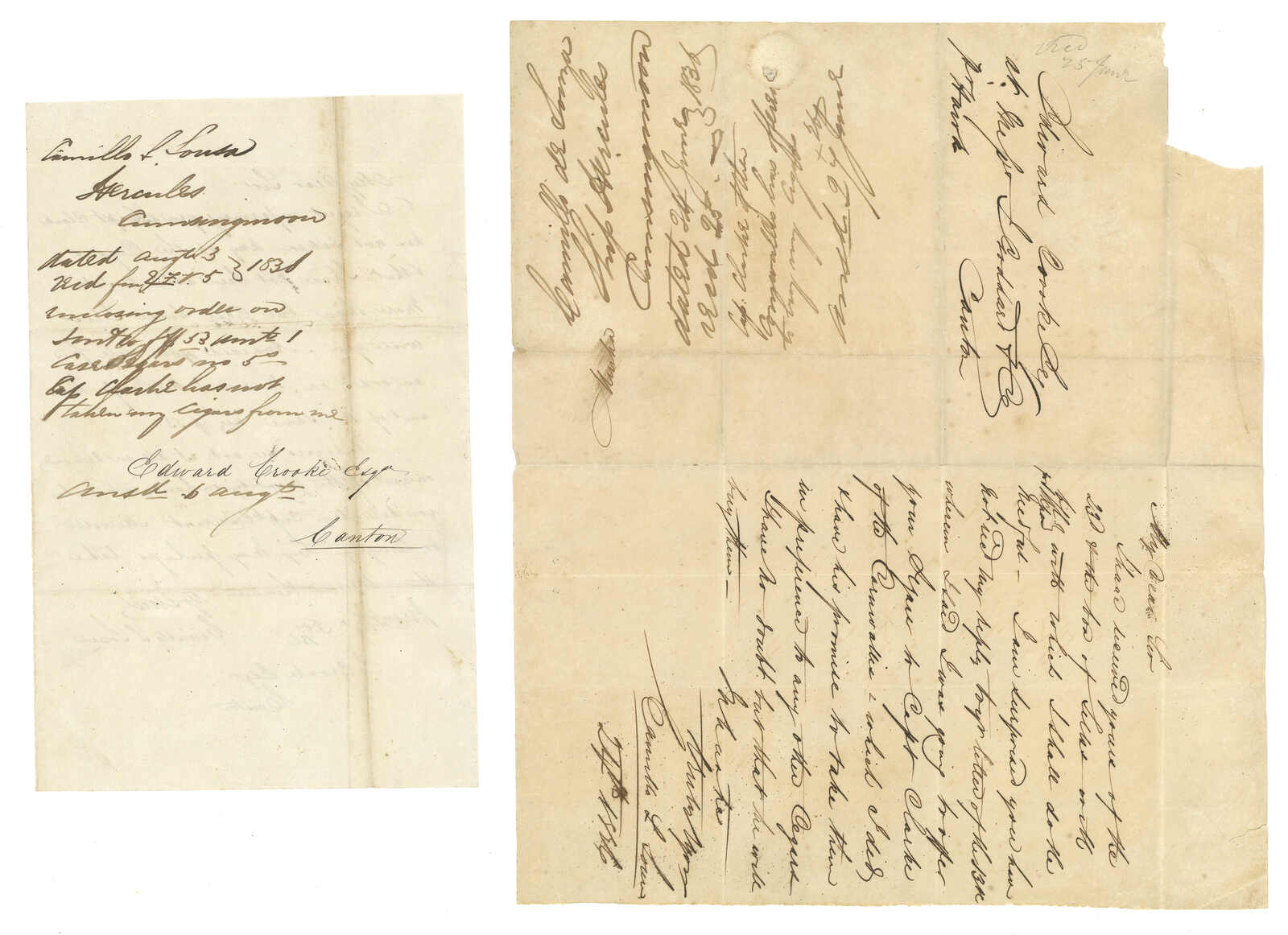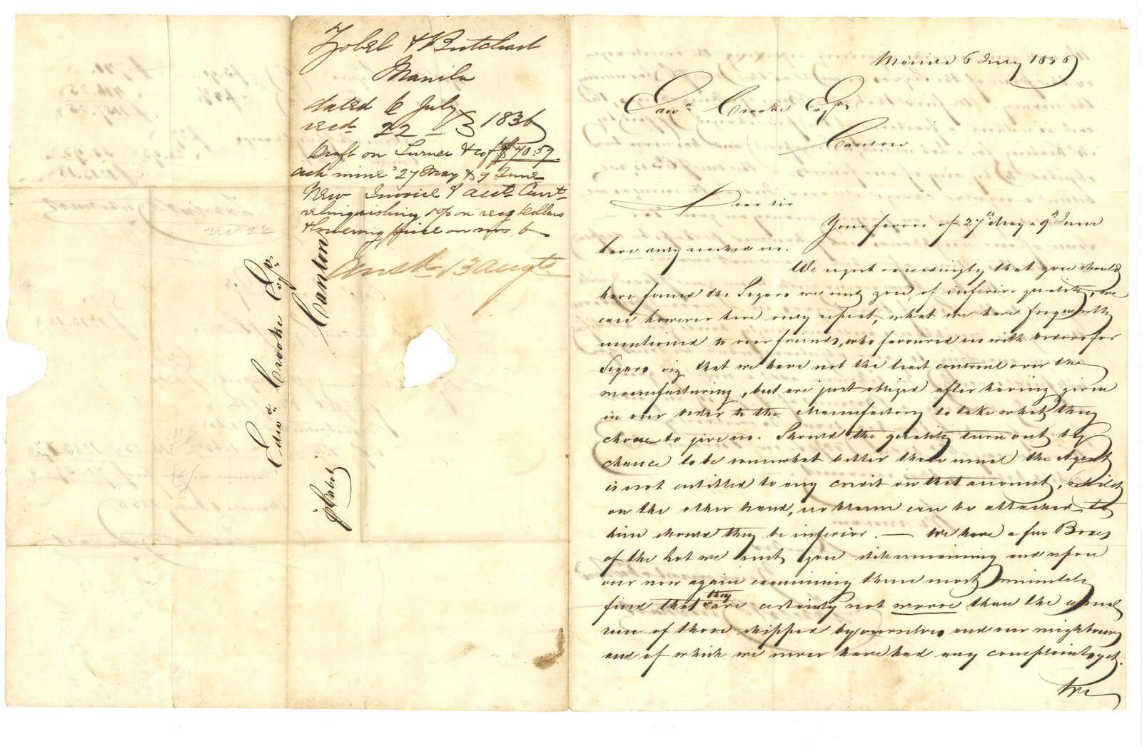 1503 cover imageFirst Opium War - The Opium Trade 4 Opium trade related Edward Crooke 局碌 correspondences Amongst the four, there are 3 mails from Opium Clipper Ship Hercules dated separately at 1836 (July 4, July 24, Aug 3), letters written on board the 'Hercules' at Cumsingoon Island to Edward Crooke in Canton; there are no postal markings other than a Chinese ink characters "局碌"on the flap; there is a usual filing fold. 3 good mails from Cumsingmoon. Another entire, dated 6 July 1836, is sent from Manila to Canton, endorsed by a private ship "p. Cabot". No postal mark since the mail is carried by a private ship. Hercules was built at Calcutta in 1814. She traded between Britain and India under a license from the British East India Company, before returning to Calcutta registry. She then traded opium between India and China before becoming an opium receiving ship for Jardine Matheson. In 1839 she was one of the vessels that surrendered her store of opium to be burned at the behest of Chinese officials at Canton.