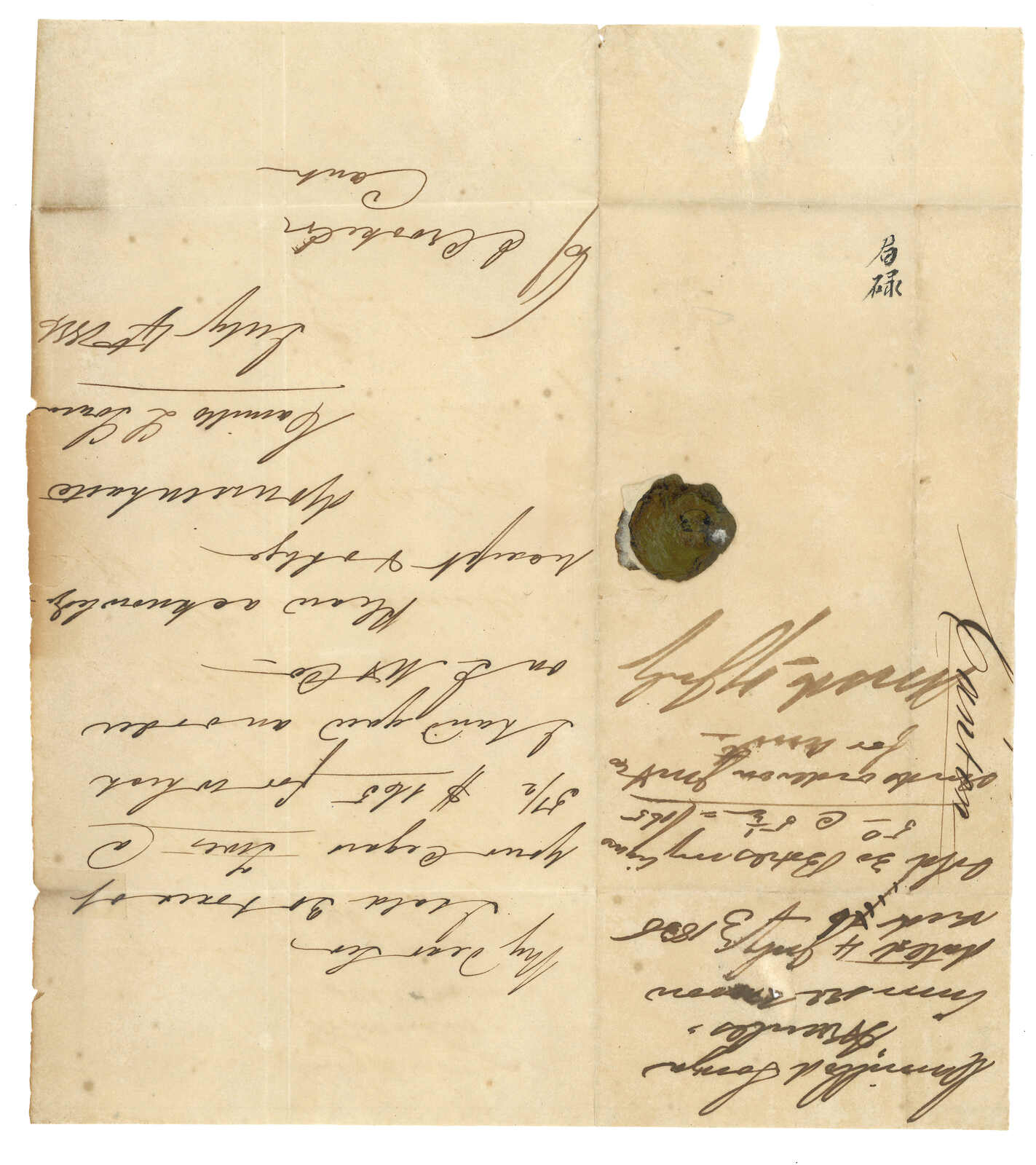 2292 cover image1860 Shanghai (7 Nov) to France. Entire letter, sent “via Marseilles” and rated “9” by h.s., alongside with Buissonnet & Co. Shanghae company seal. Transit Hong Kong (11 Nov). Arrrived France (26 Dec).
