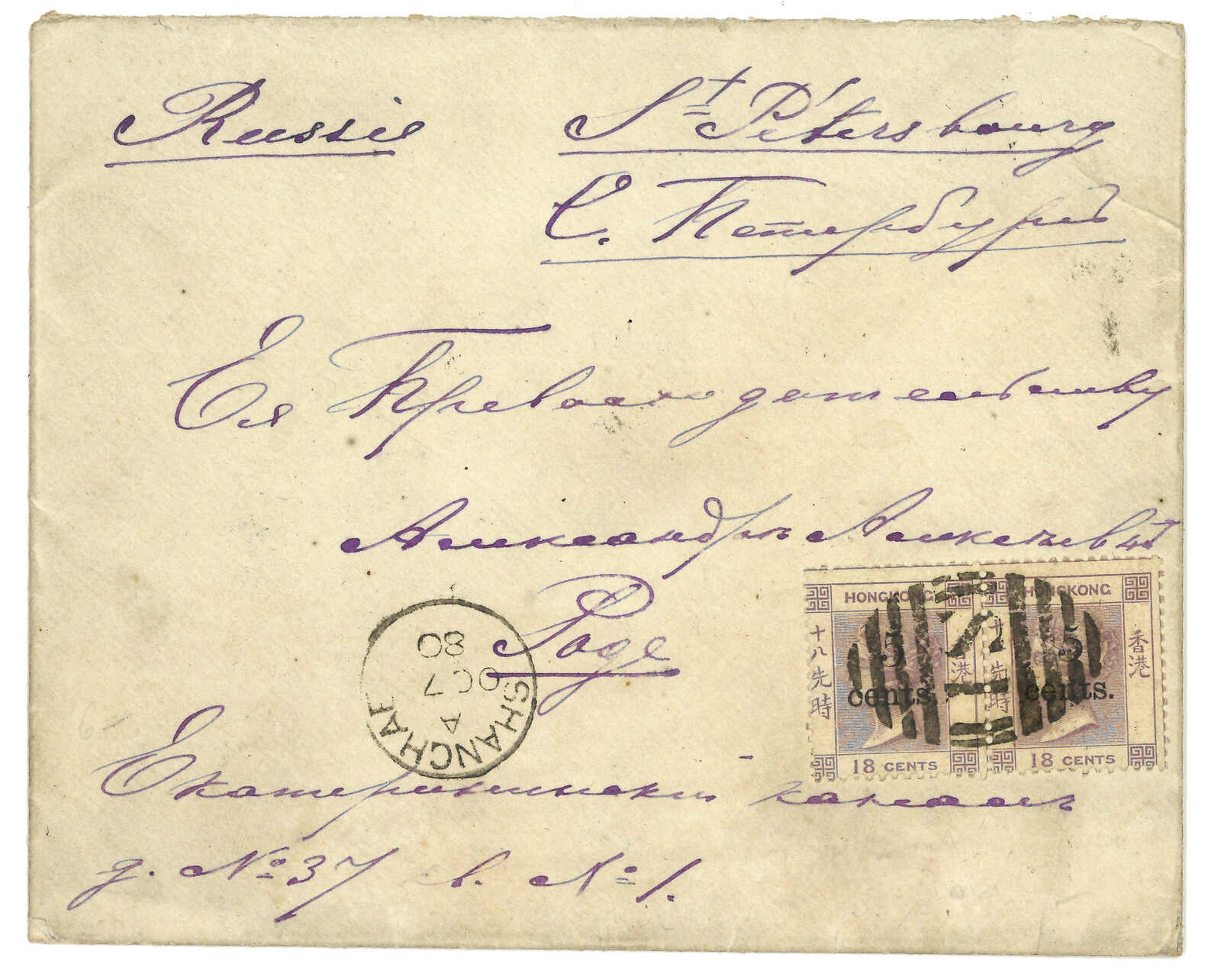 2294 cover image1880 (7 Oct) an envelope addressed to St. Petersburg, Russia, franked by a pair of 1880 HKQV 5-cents ovpt. 18c lilacs, cancelled by a very fine black “S1” numeral obliterator, matching a very fine “SHANGHAE A” c.d.s. alongside. On the reverse side, Hong Kong c.d.s. (10 Oct), Naples and St. Peterburg c.d.s. First year usage of HK QV 5 cents ovpt. 18c on a Treaty Port item. Very rare franking and an exotic destination to Russia in 1880s. This is an exhibition postal history item with RPSL Certificate of Genuineness. Provenance: Richard C.K. Chan Collection – Cavendish Auction Oct 2003