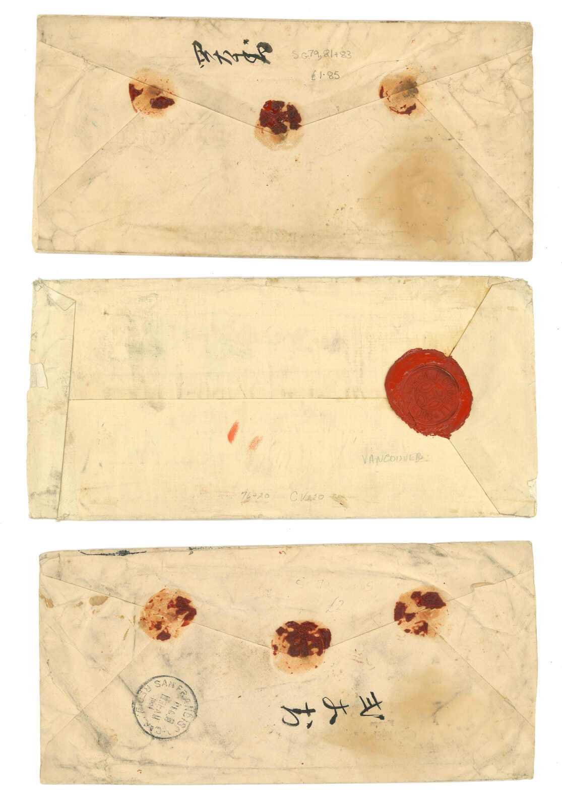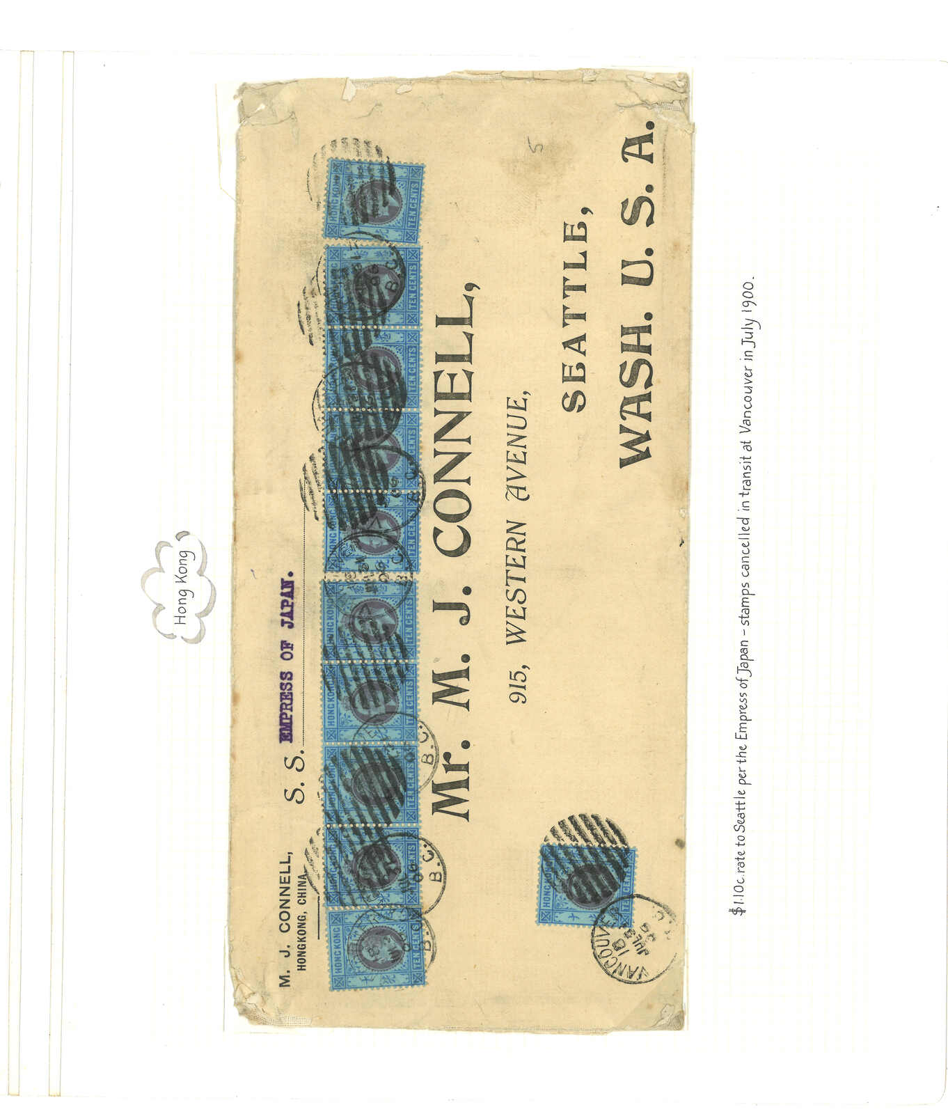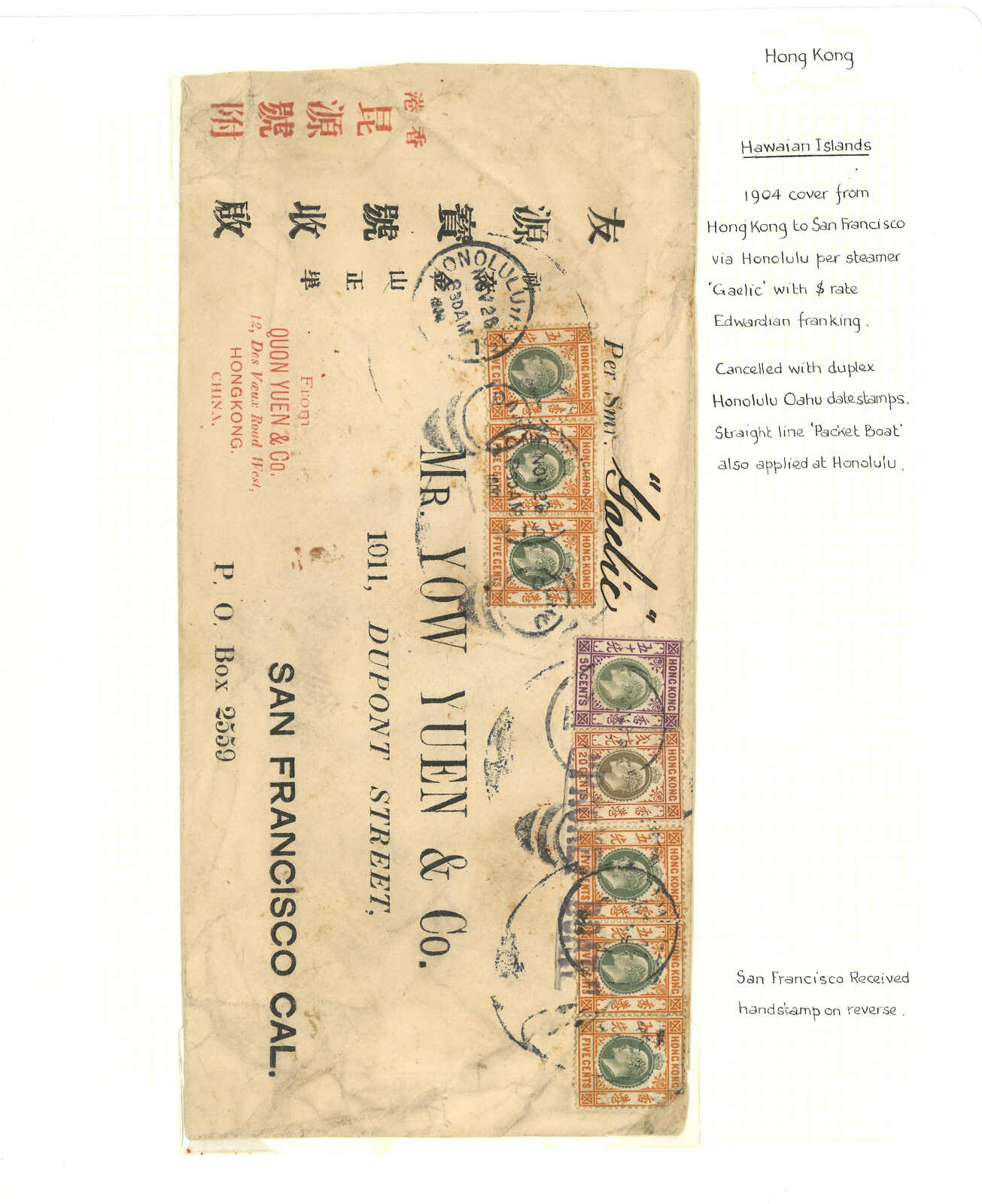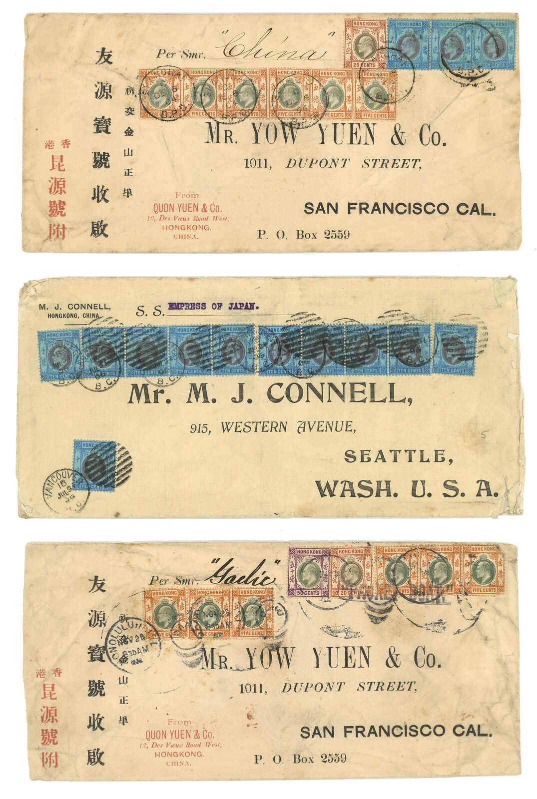 1612 cover imageA group of three covers using Overseas Cancellations on HK stamps: 1. 1904 (28 Nov) Yow Yuen large printed envelope to San Francisco per Smr. “Gaelic” bearing K.E. VII 6 x 5c, 1 x 20c, 1 x 50c, tied by Honolulu Island “OAHU” duplex with straight-line “PACKET BOAT” handstamp in purple. The reverse with SF arrival c.d.s. (8 Dec) and red wax seals; Very fine use of the Hawaian Island Overseas cancellation on HK stamps. 2. 1906 (18 July) M.J. CONNELL SEATTLE large printed envelope to Washington U.S.A., bearing K.E. VII 11 x 10c blue , tied by “VANCOUVER B.C. / 18 JUL 06” DUPLEX with barred circled cancellation . Very Fine . 3. 1904 (6 Dec) Yow Yuen large printed envelope to San Francisco per Smr. “China” bearing K.E. VII 6 x 5c, 1 X 20c, 3 X 10c, all tied by “SHANGHAI B.P.O.”. The reverse with SF arrival c.d.s. and red wax seals; Fine.