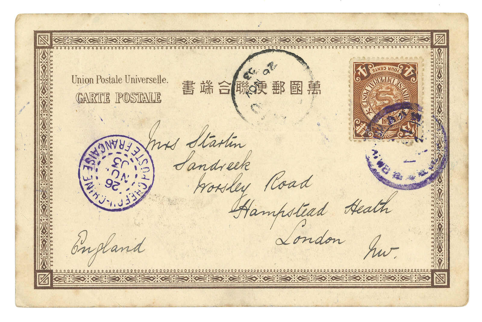232 cover image1903 Weihaiwei to England. PPC, f.w. Coiling Dragon 4c, tied by scarce "LIU KUNG TAU / WEIHAIWEI" bilingual cds in blue. Transit Chefoo Chinese PO (26 Nov), Chefoo French PO (26 Nov).