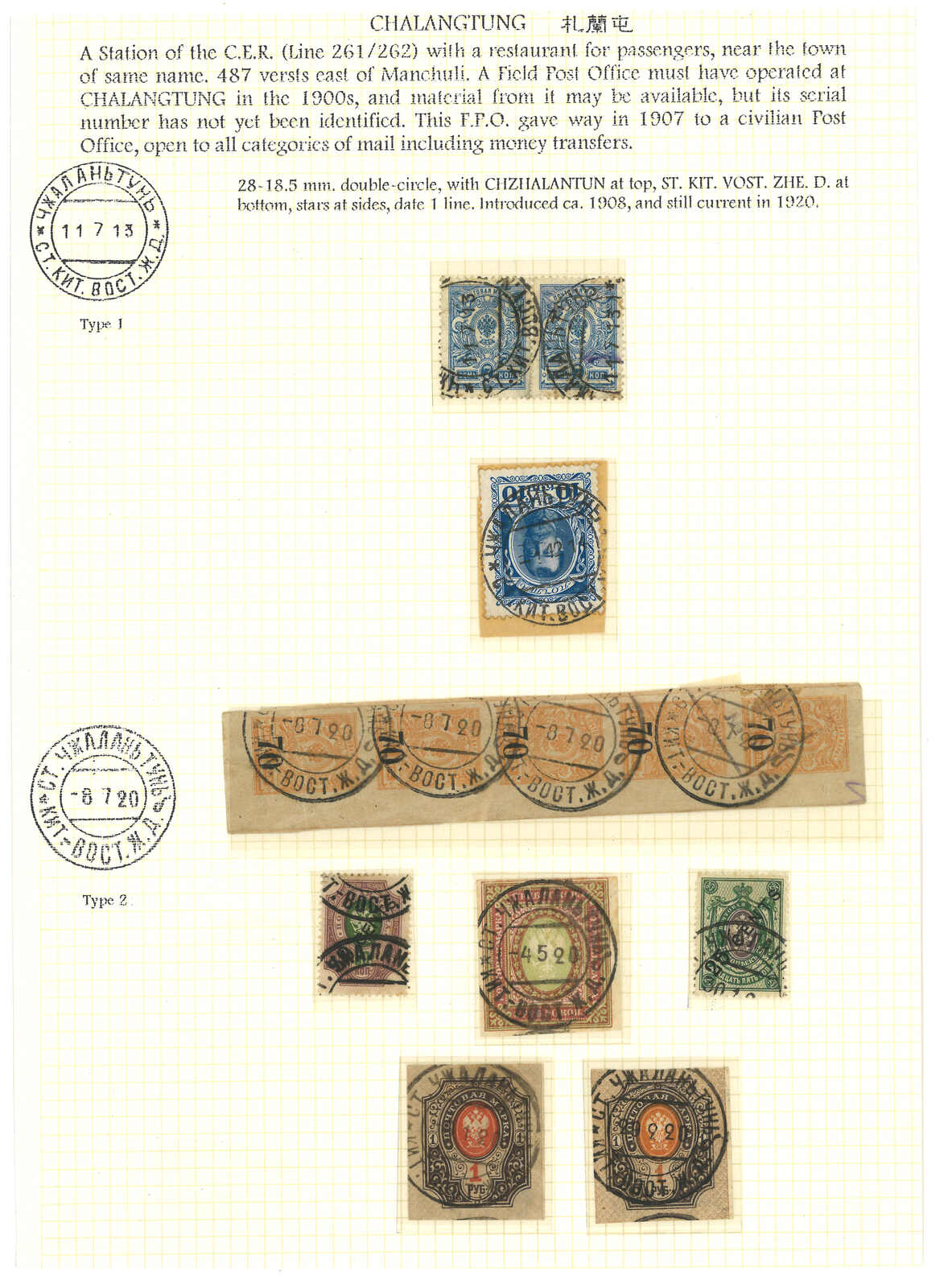 A group of 8 Coat and Arms and Romanov used stamps used by Chalangtun Russian PO type 1 and 2 cds.
