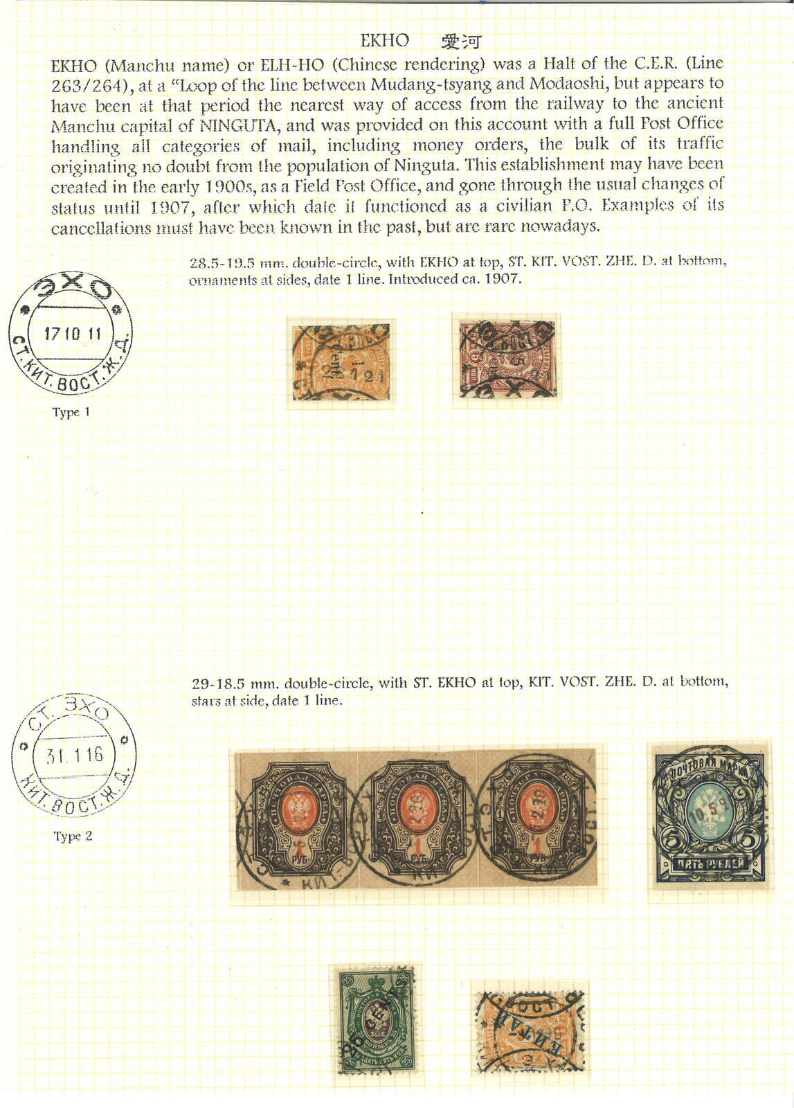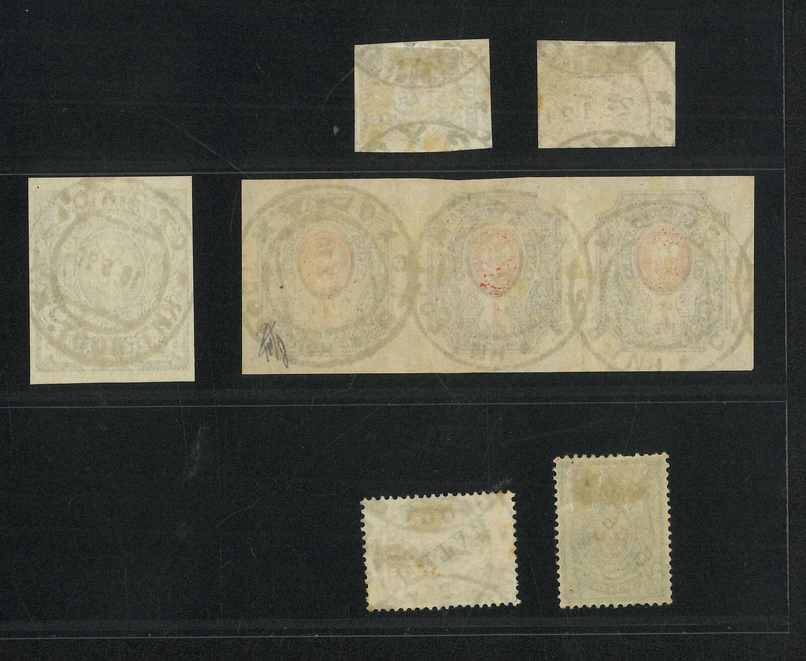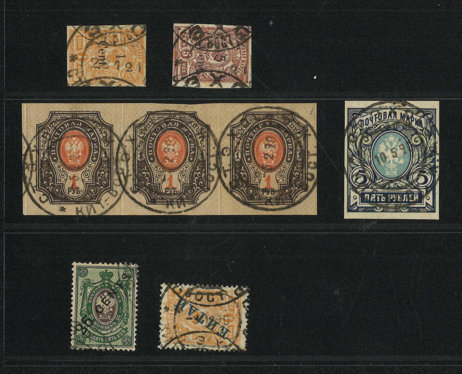 A group of 6 Coat of Arms used single and mulitples, tied by scarce Ekho Russian PO type 1 and 2 cds. Examples from Ekho are very scarce.