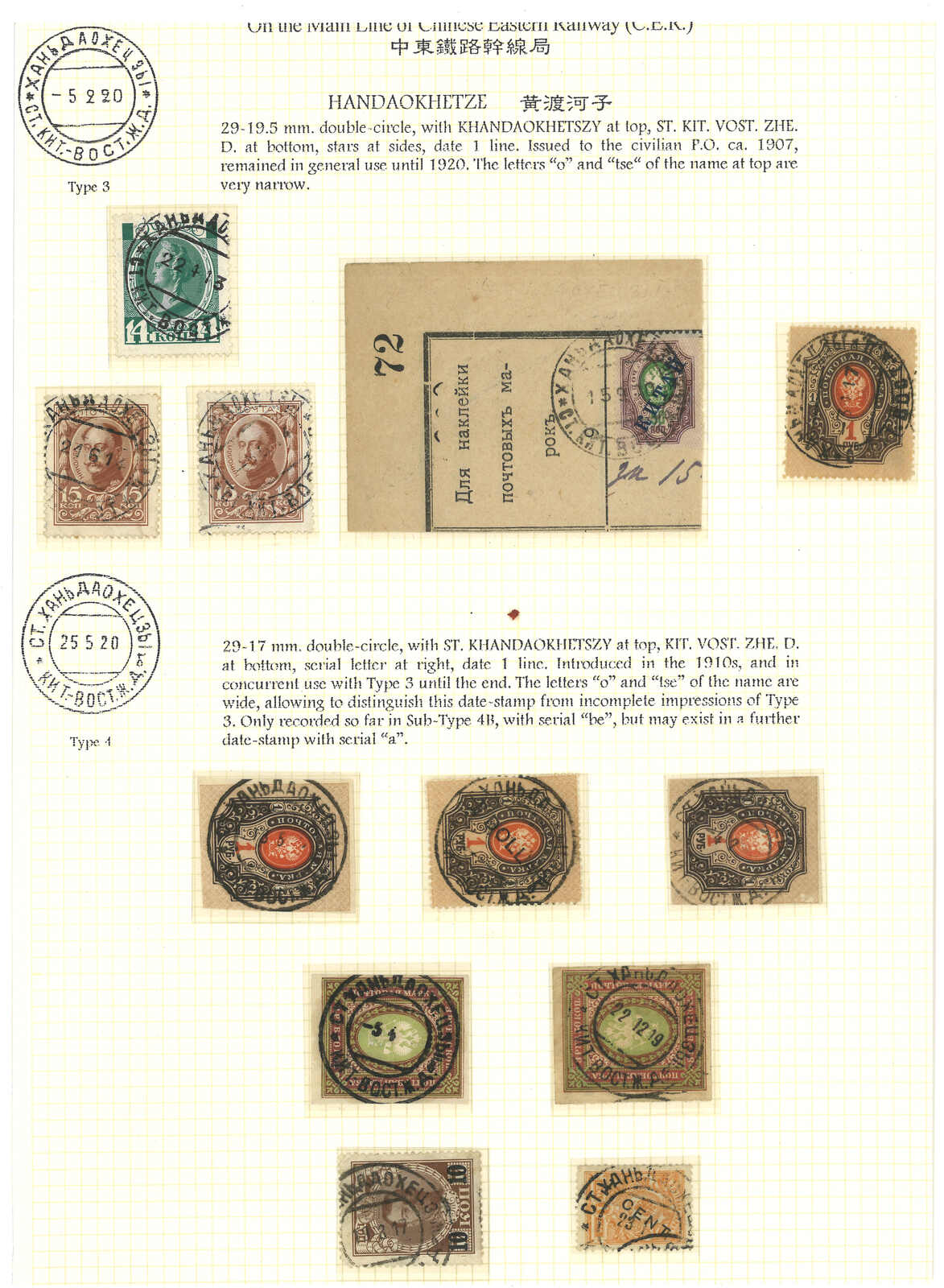 A group of 12 Coat of Arms used stamps and piece, tied by Handaokhetze Russian PO T&S type 3 and 4 cds. Type 3 postmark was used since around 1907 when the PO was converted to civilian status.