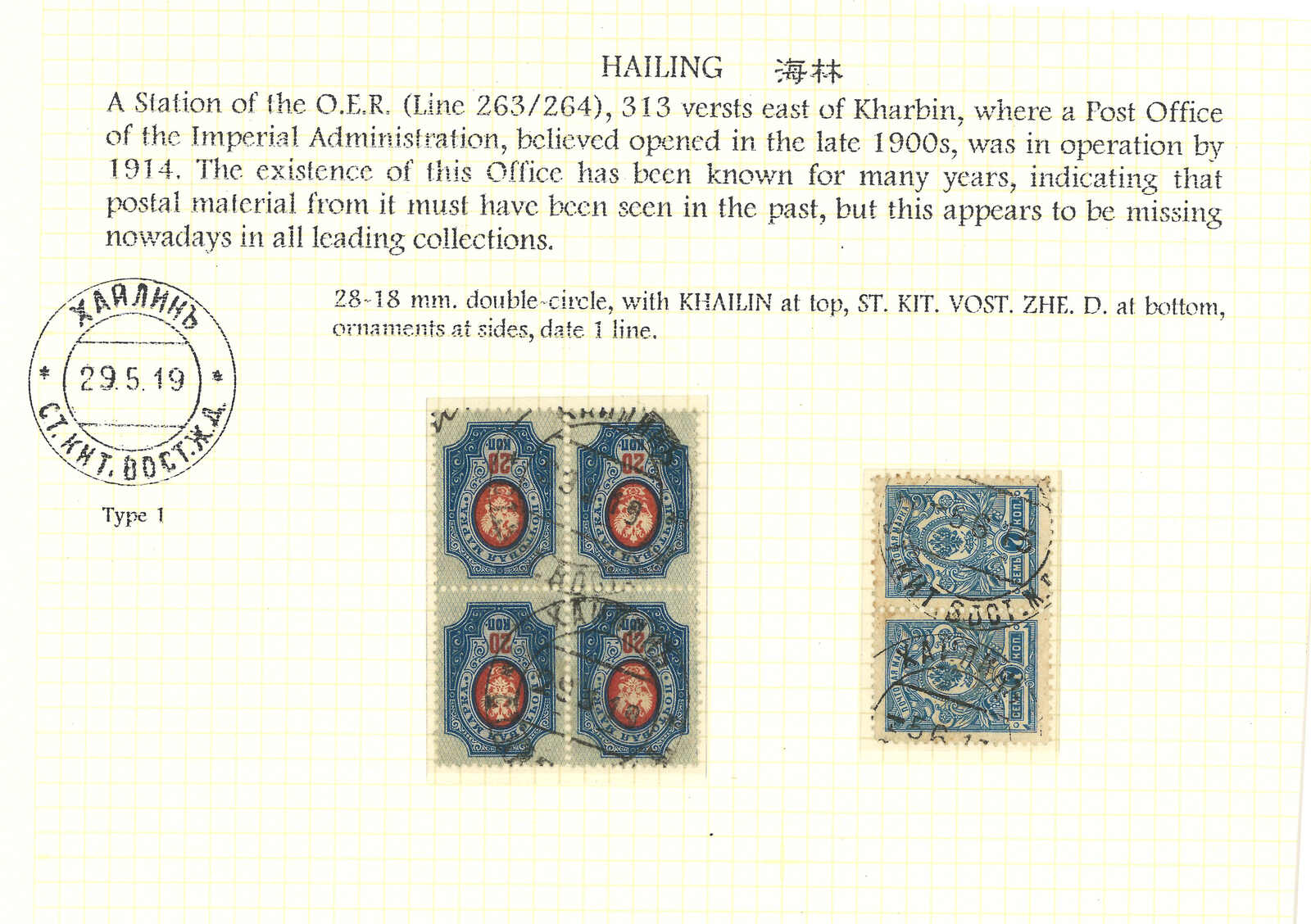 軍徽圖7戈比及20戈比連票舊票,銷極罕之海林俄局日戳。海林位於哈爾濱東,該局營運多年,但T&S未記錄任何存世例子,可見極罕。(Image 1)
