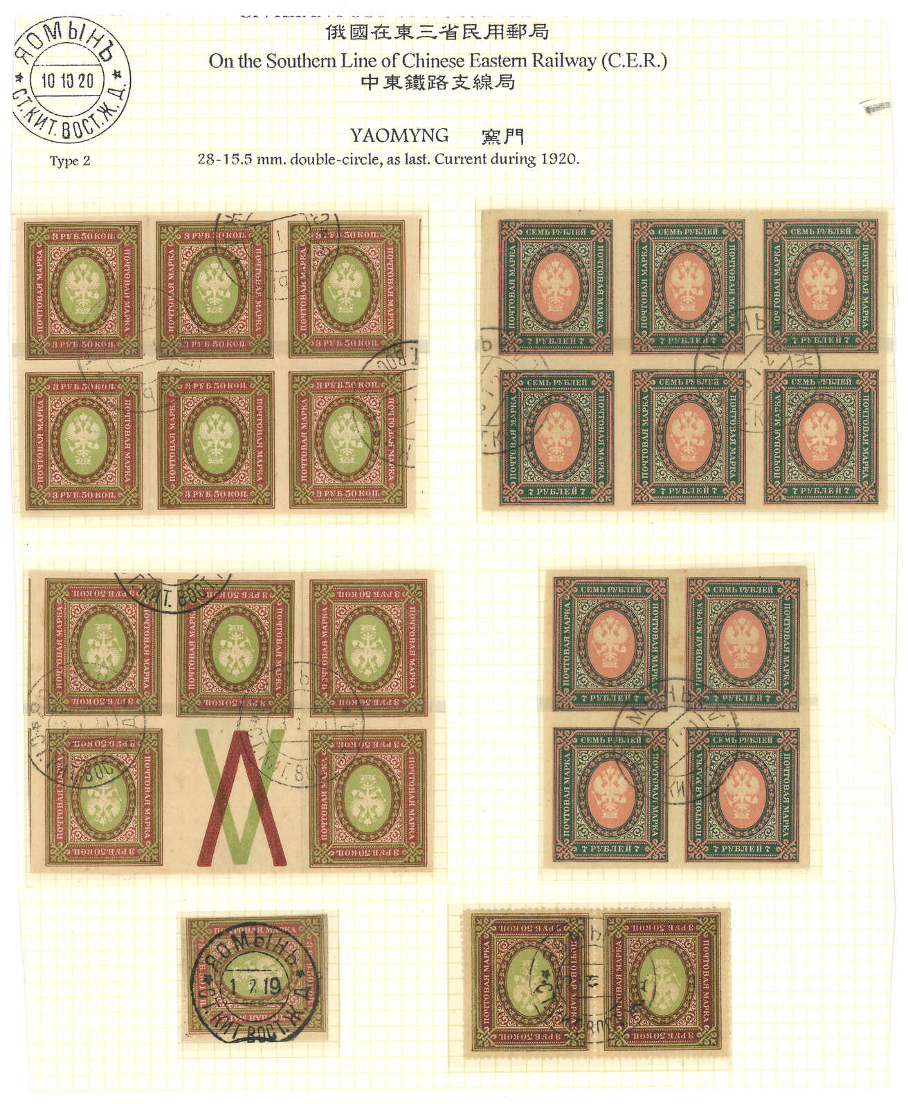 A group of 6 Coat of Arms used stamps in single or multiple, tied by scarce Yaomyng Russian PO T&S type 2 cds. Particularly scarce in the format of large block. Yaomyng is at the south of Harbin.