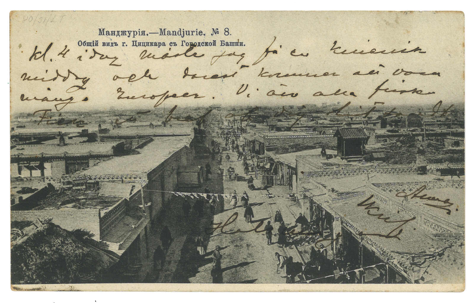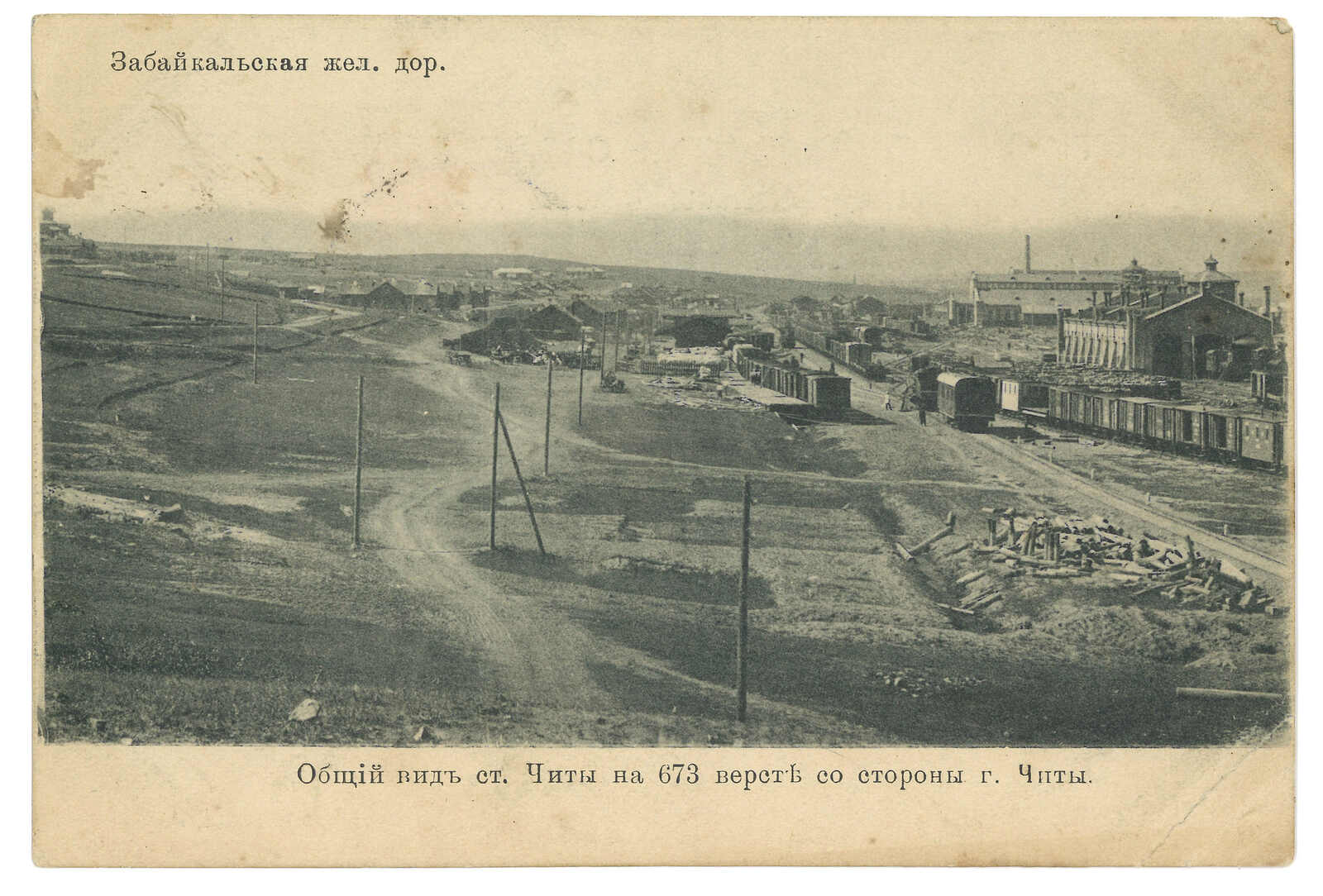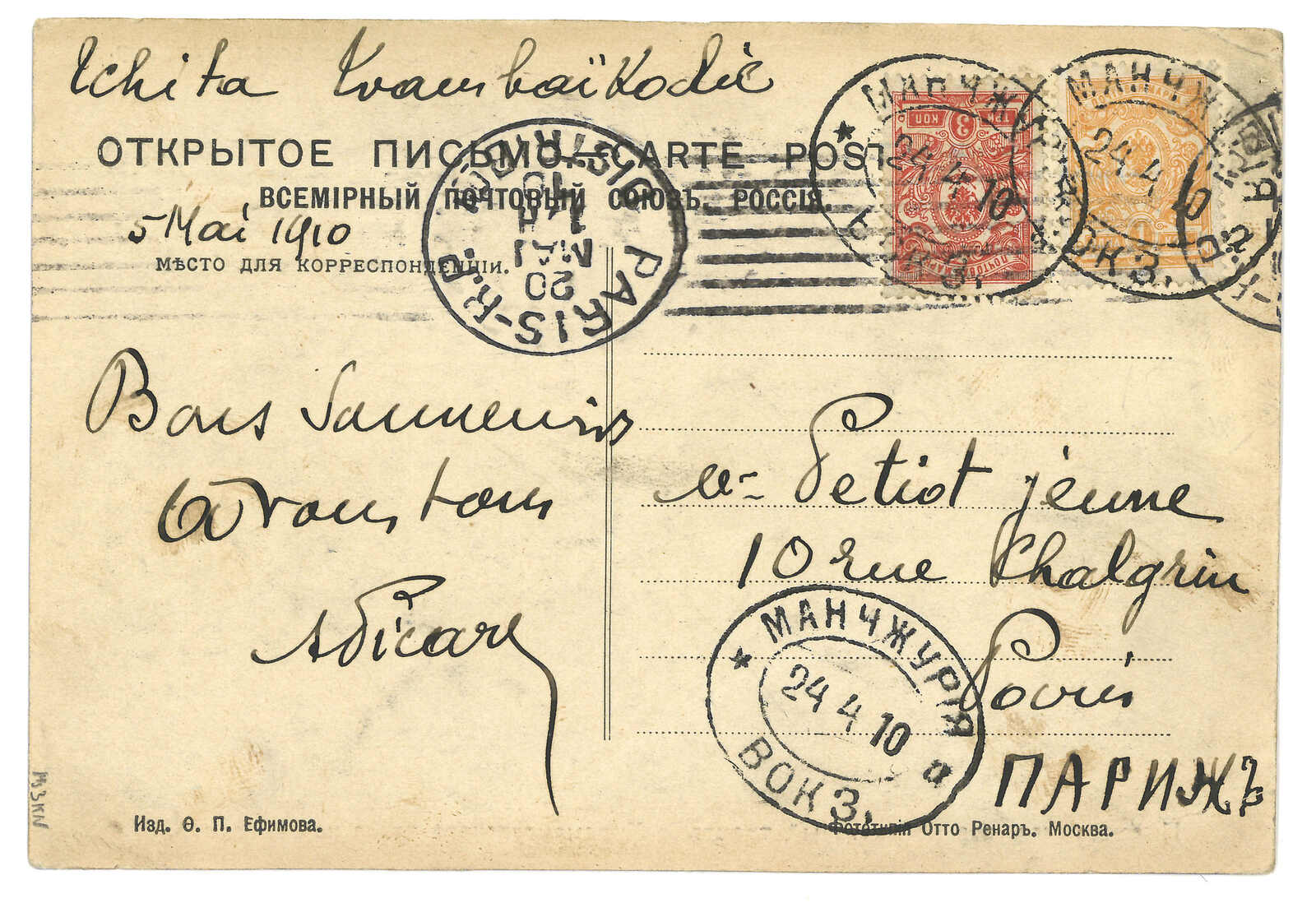 1910 (24 Apr) View PPC from Manchouli Station to France, f.w. Coat of Arms 1k + 3k, tied by Manchouli Station T&S type 2 oval d.s. Arrived Paris (20 May).