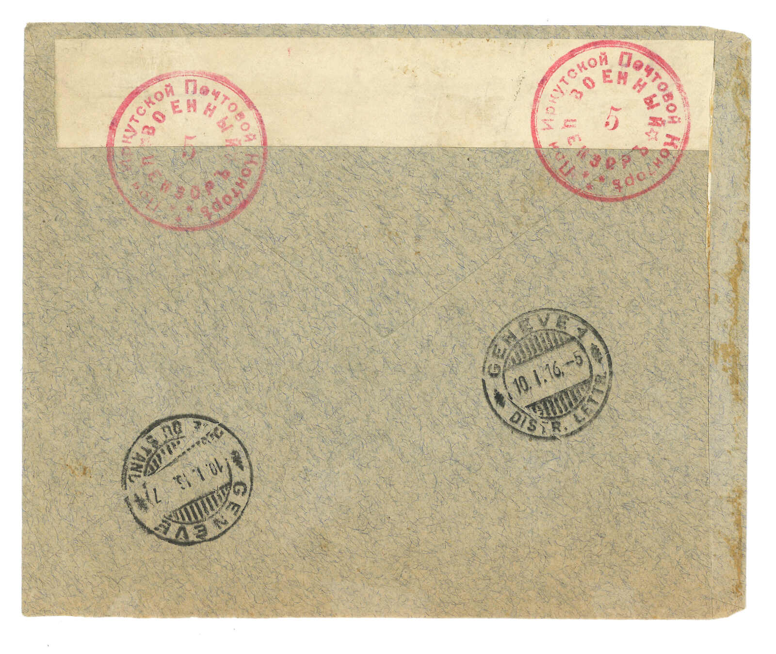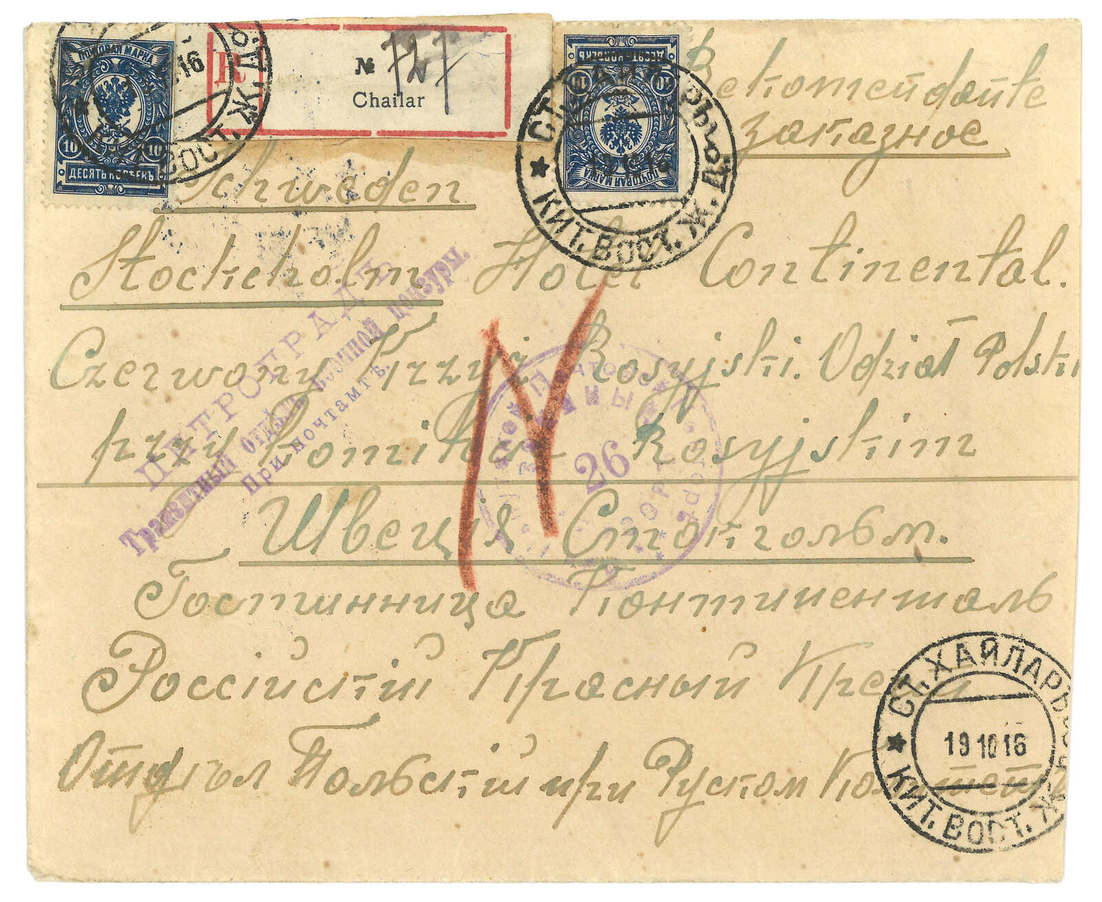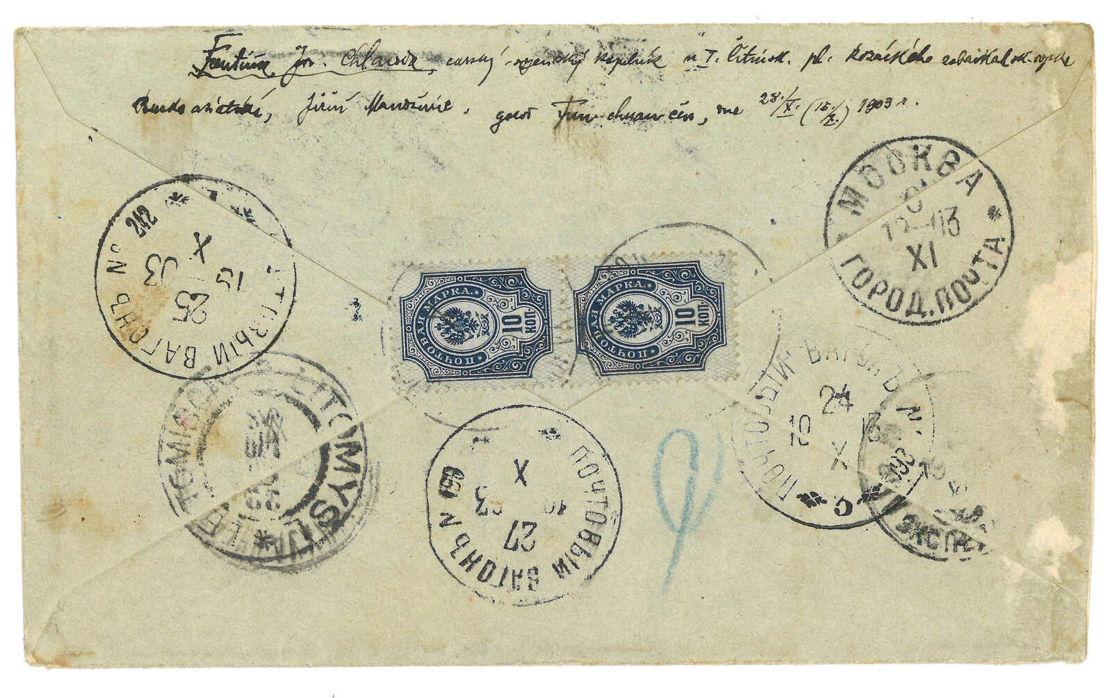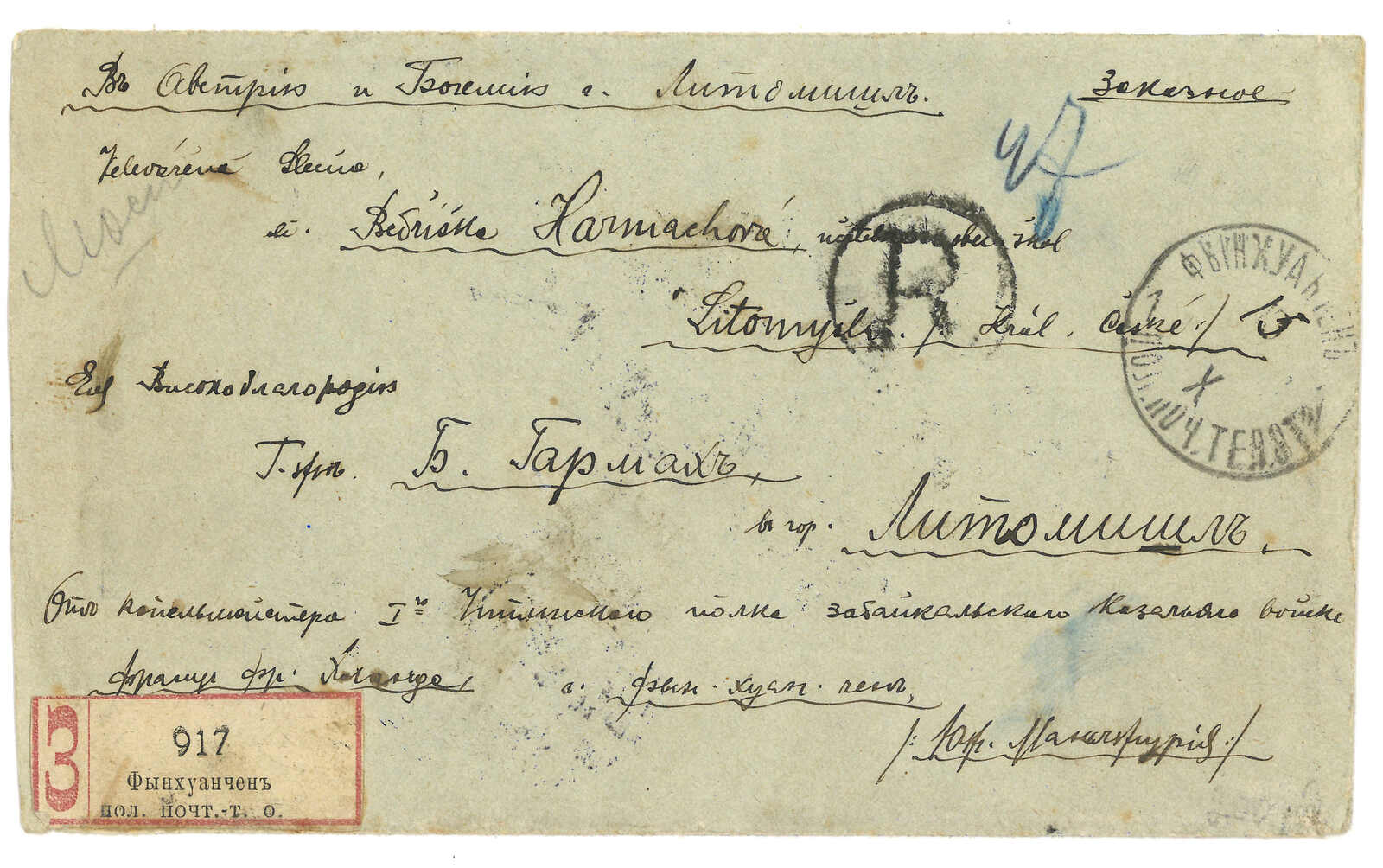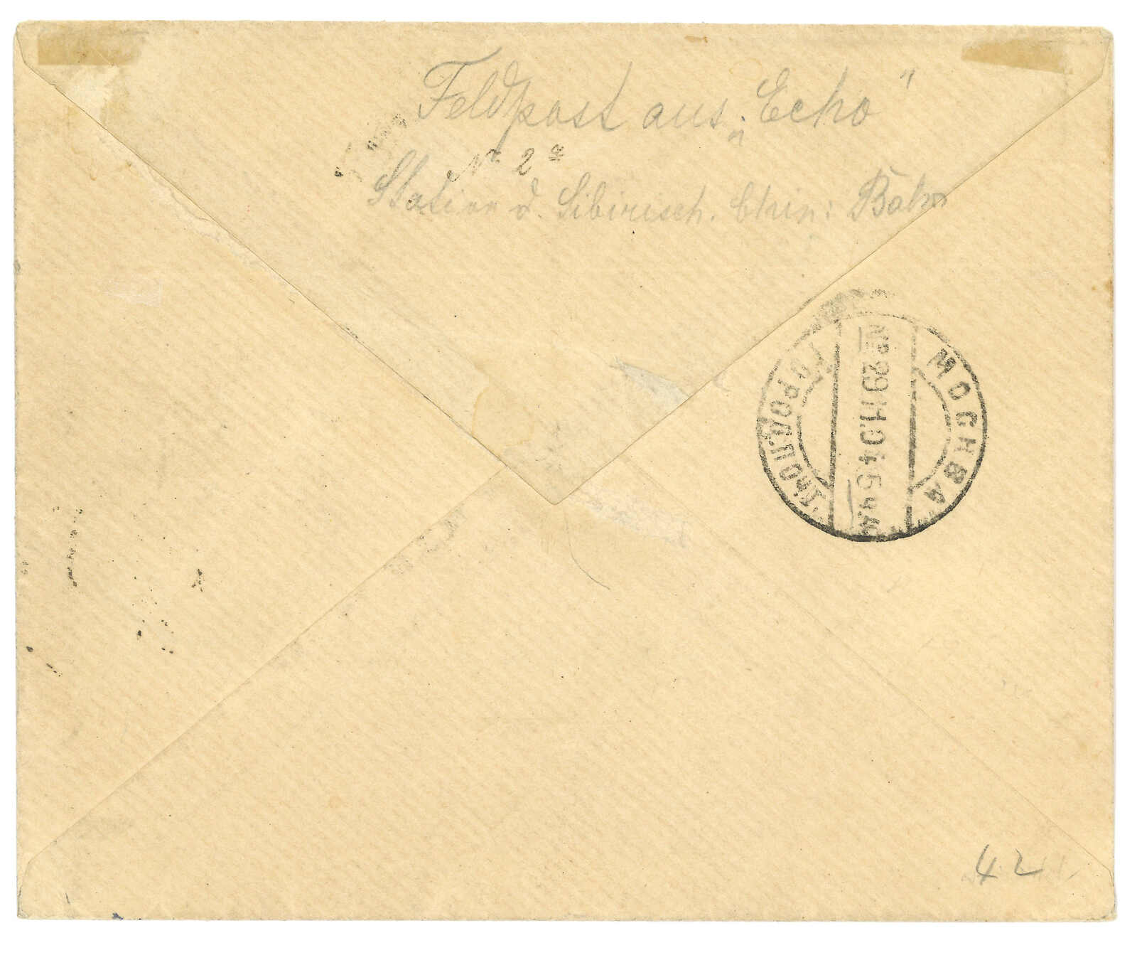 1904 (7 Nov) Russian military cover from Ekho to Moscow, frankless, applied with General Field Hospital No. 1 (at Ekho) circular seal, Chinese Eastern Railway line 264 transit cds. Arrived Moscow (29 Nov). Ex- Alder. T&S