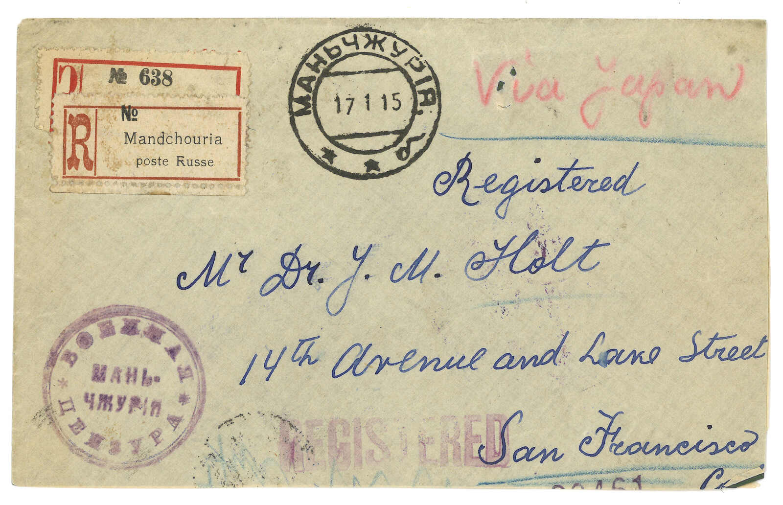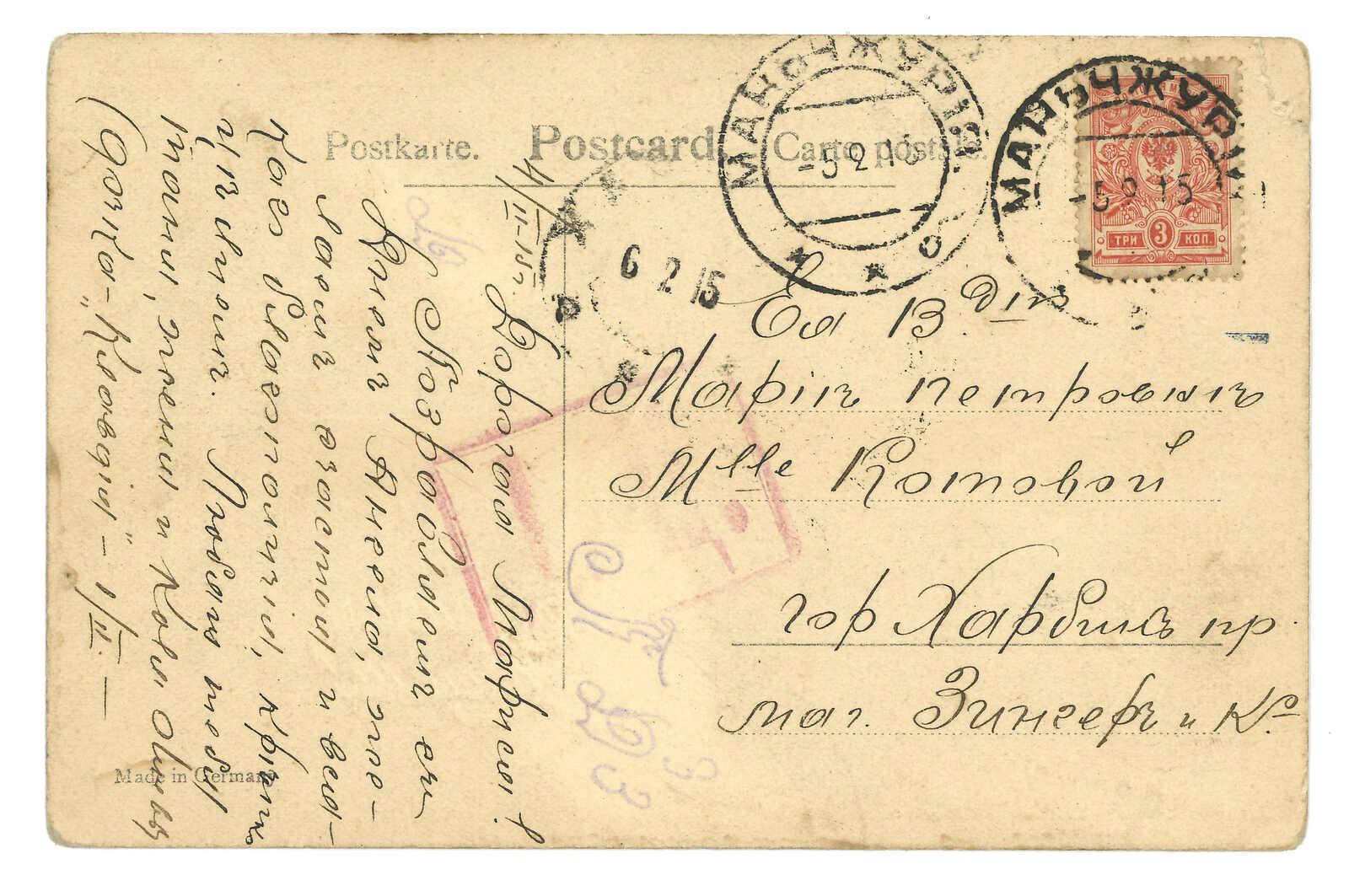 1915 Manchouli (5 Feb) to Harbin. Picture postcard, f.w. Coat of Arms 3k, tied by Manchouli Russian PO T&S type 2b cds., alongside with type 4 censor mark. Arrived Harbin Russian PO (6 Feb).