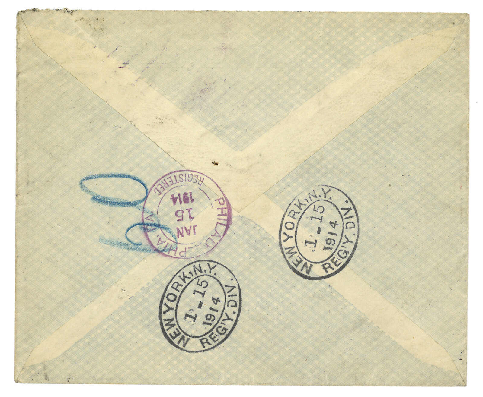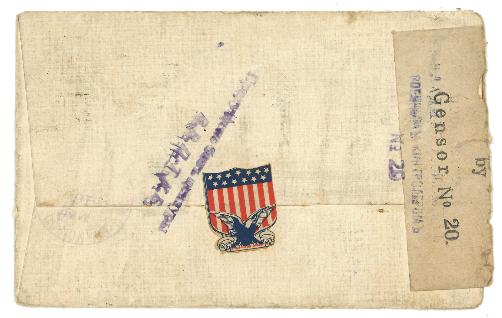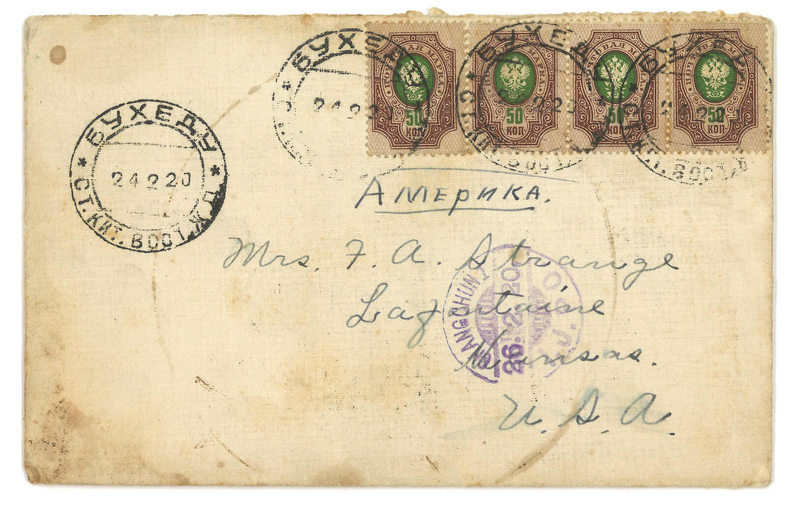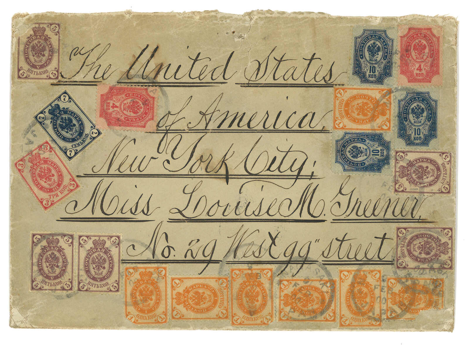 自俄國船隻上投遞寄美國,貼軍徽圖票x19,於長崎中轉鈐J1型日戳,旁鈐J3型PAQUEBOT羅曼諾夫4戈比,於敦賀中轉時銷T&S J6型日戳,旁鈐J3型PAQUEBOT橫戳。8.3抵紐約。(Image 1)
