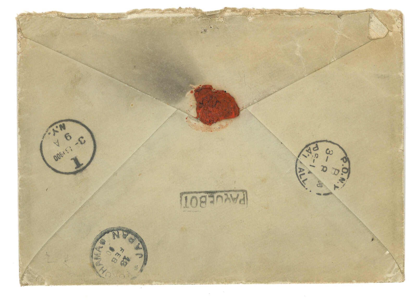 1900 (9 Feb) Cover posted at Russian ship, addressing to USA, f.w. Coat of Arms x19, tied by Nagaski T&S type J1 cds upon transit, along with type J3 PAQUEBOT marking. Arrived New York (3 Aug).