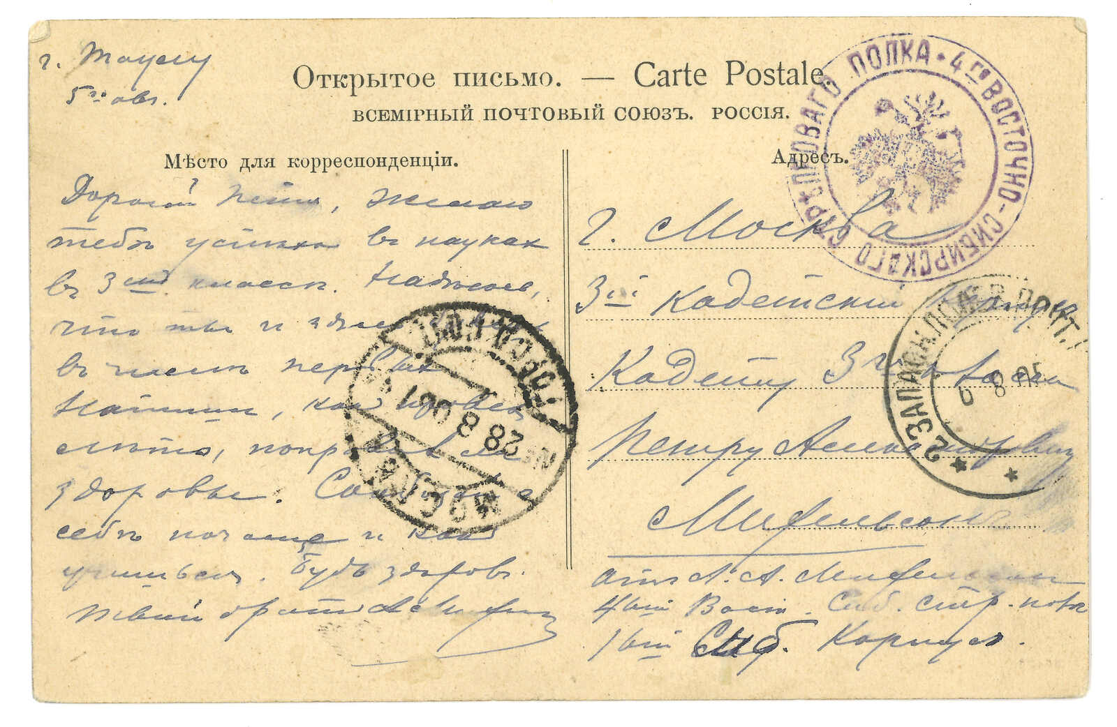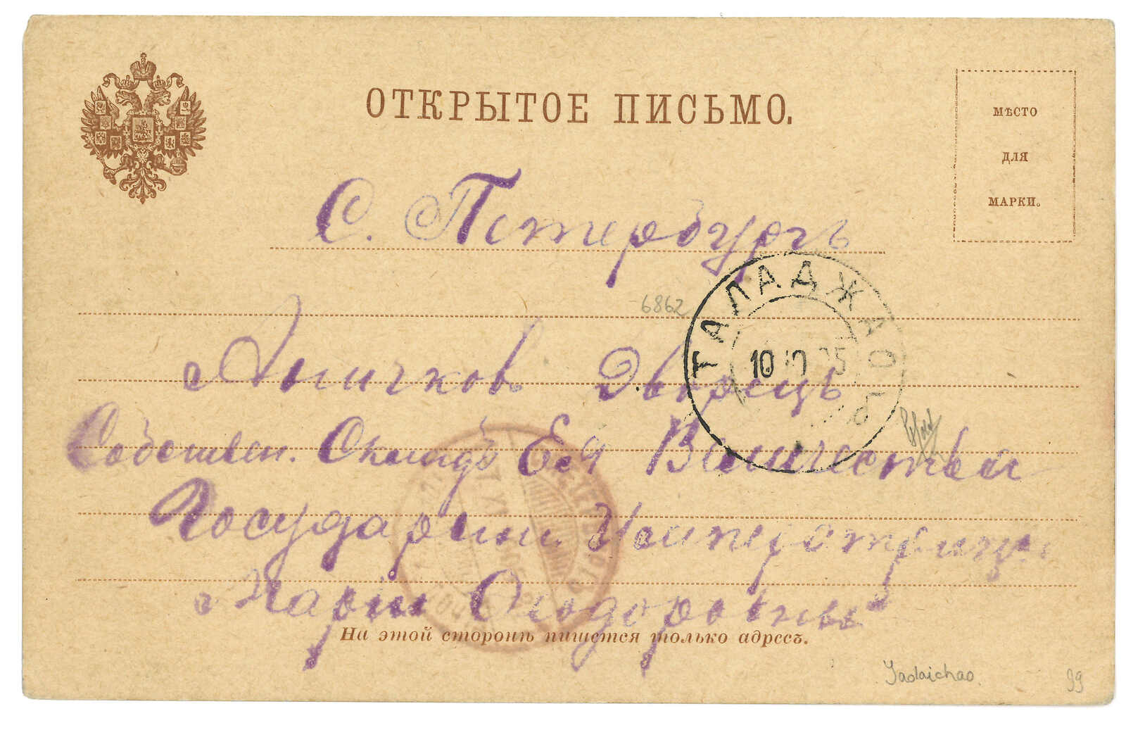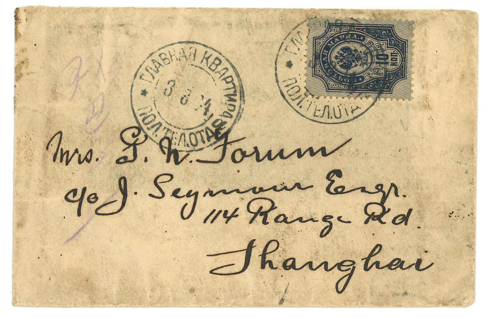 1905.4.14 陶賴昭寄俄國,無貼票,鈐預備軍郵30局日戳。Kenneth