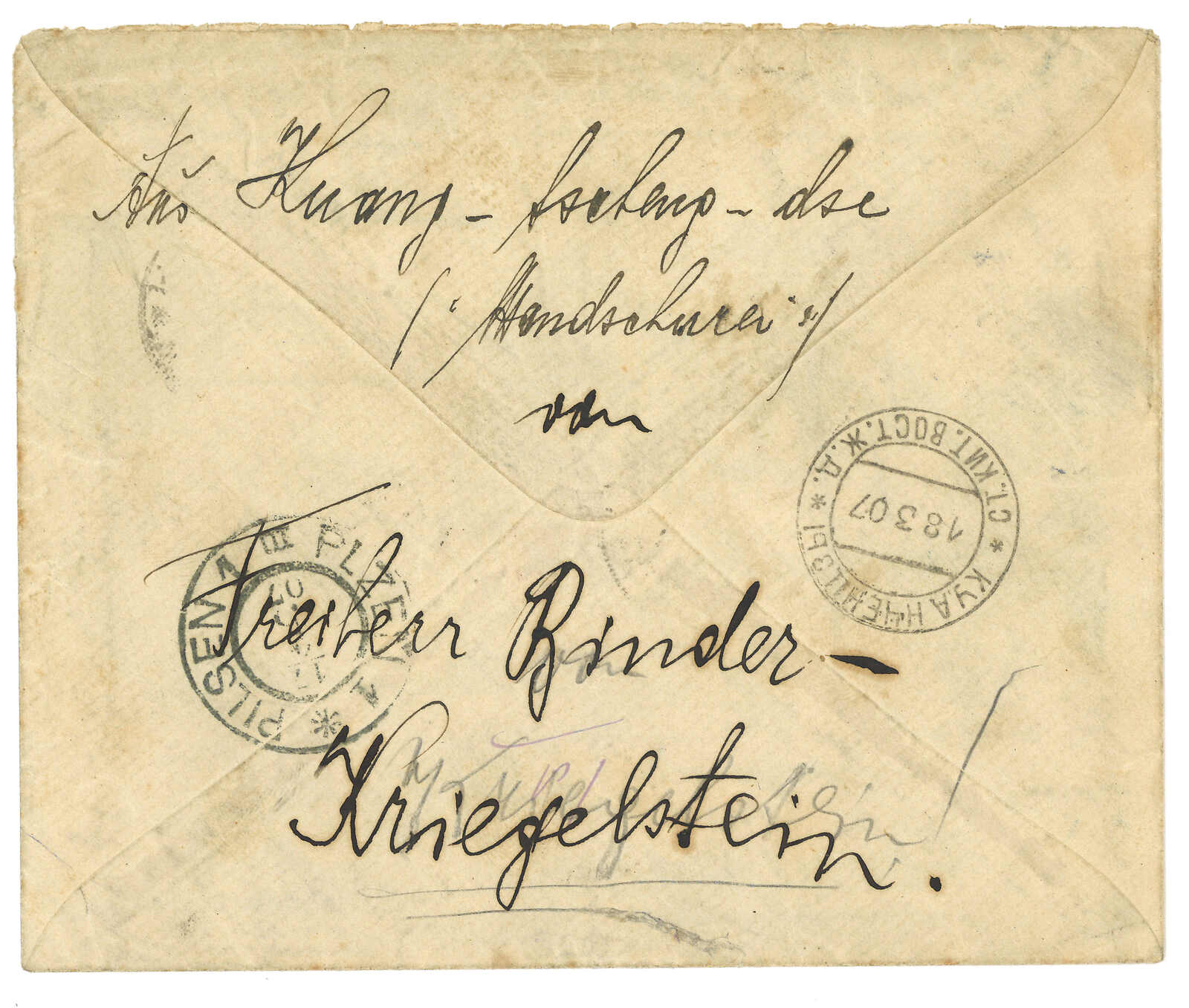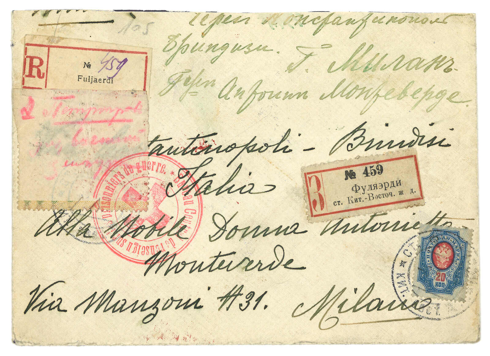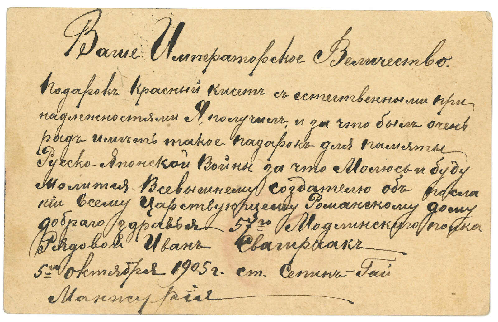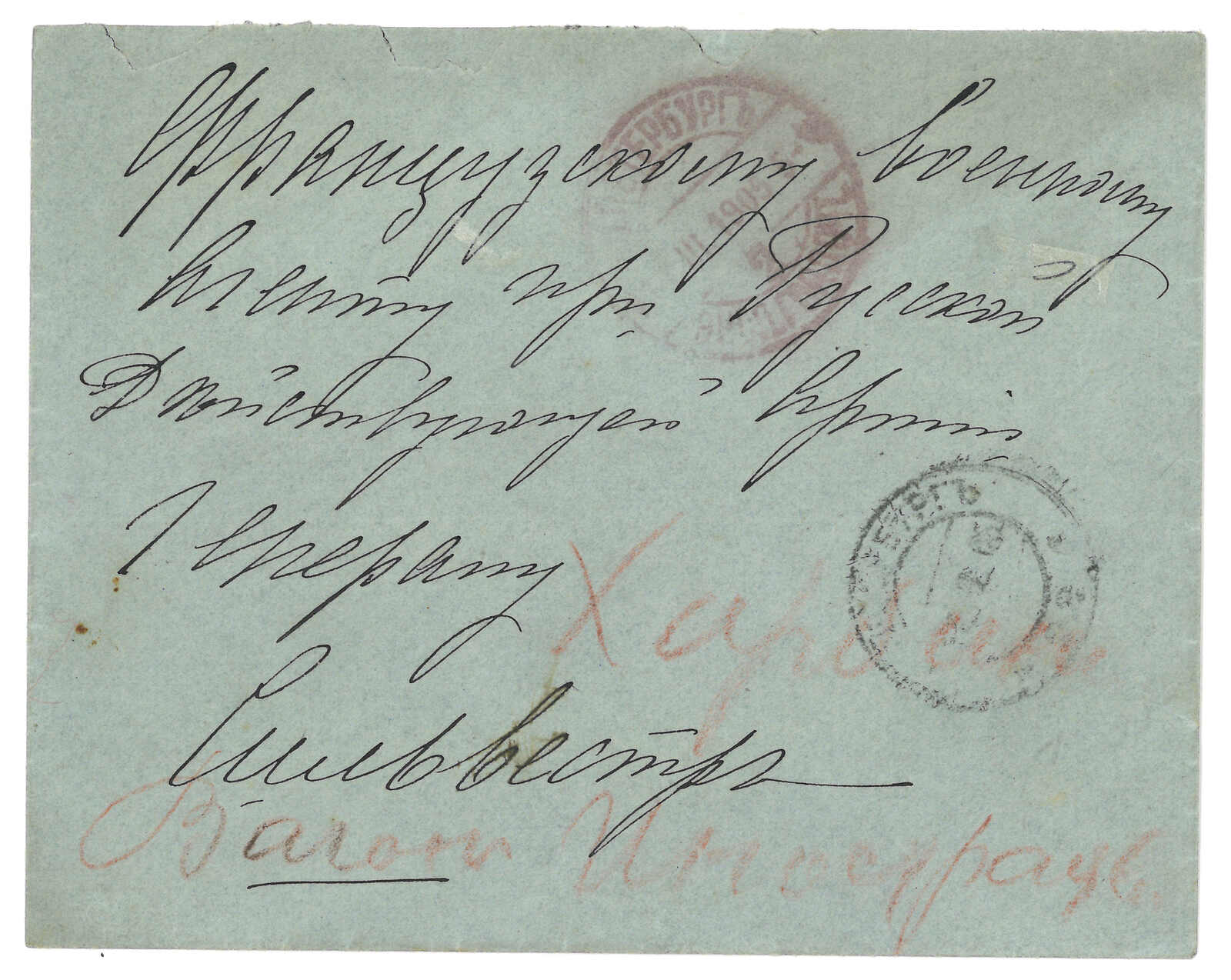 1904.11.7 俄軍軍郵封,自愛河寄莫斯科,無貼票,鈐第一野戰總醫院圓戳(位於愛河)及中東鐵路264線中轉戳。11.29抵莫斯科。Alder舊藏。T&S未見任何愛河俄局之存世封片,故此為入手實寄封之唯一途徑。(Image 1)