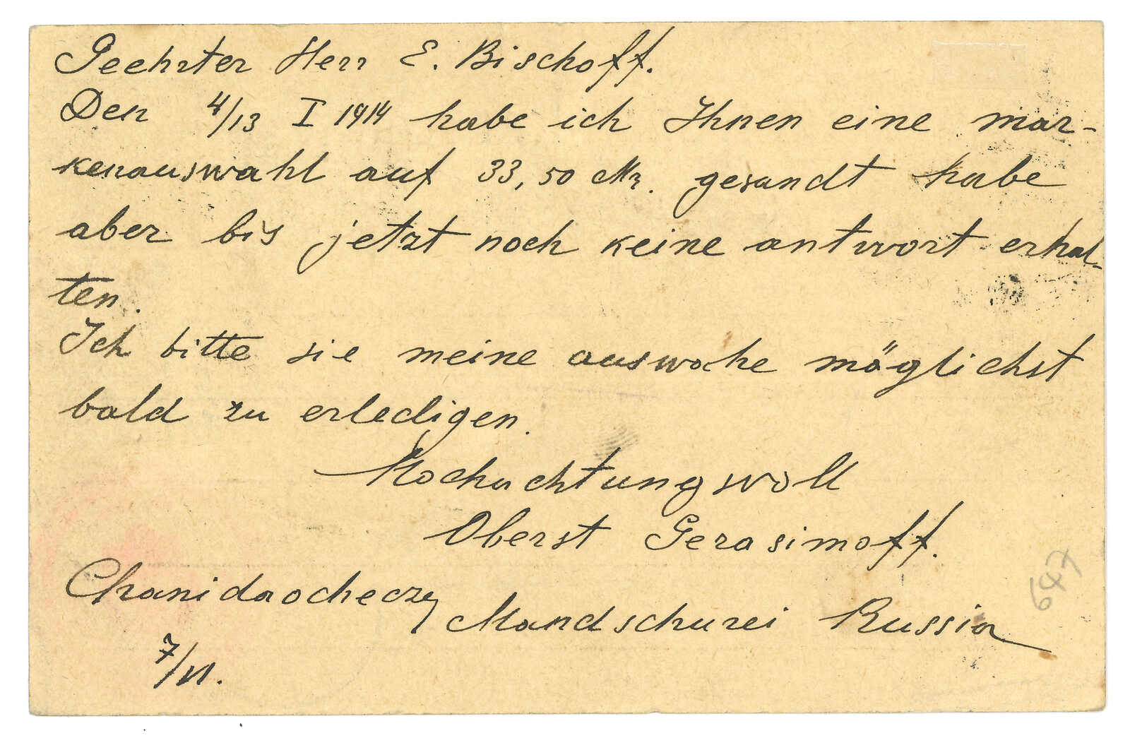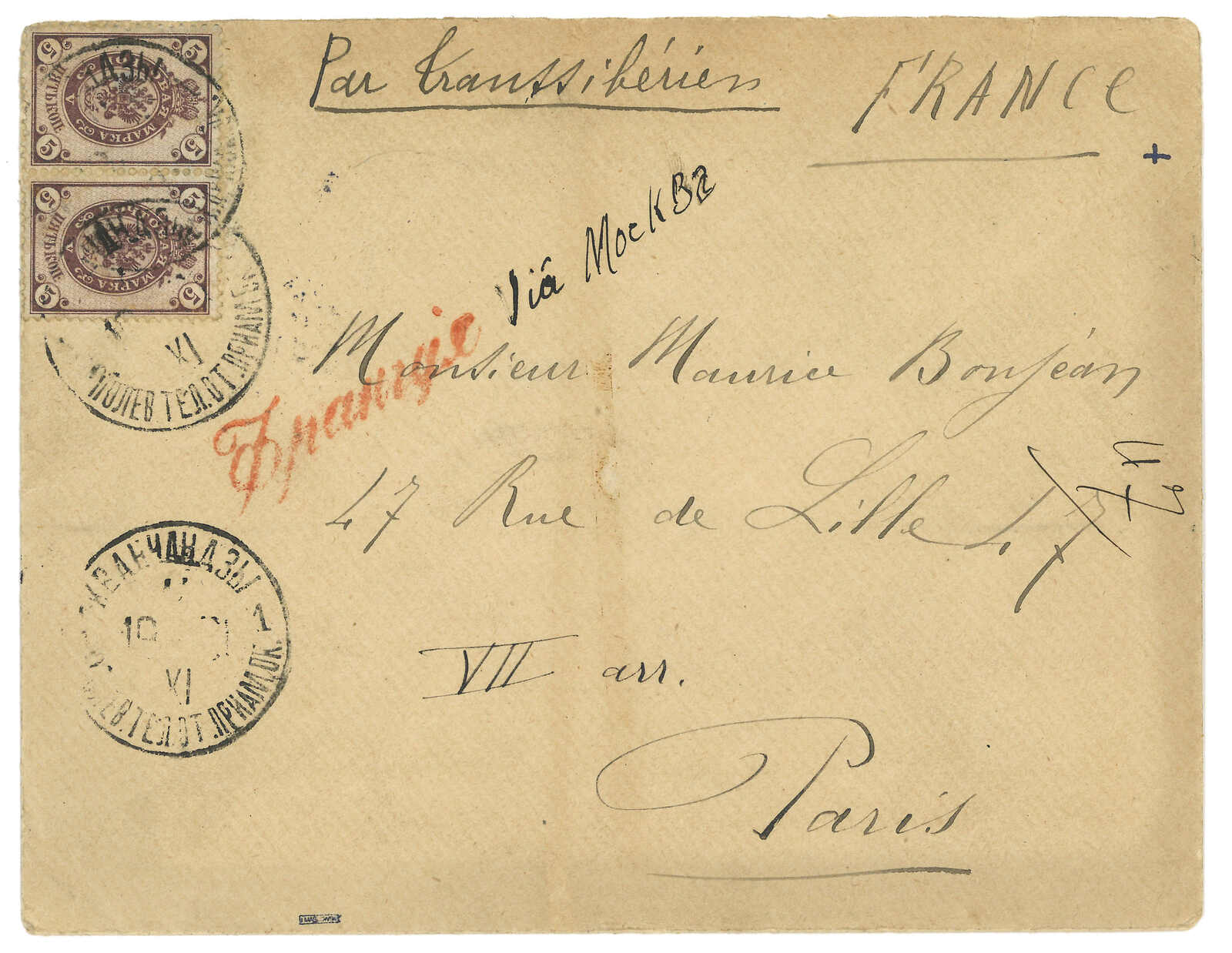 1911 (21 Oct) Coloured PPC from Manchouli Station to France, applied with Manchouli Station T&S type 2 oval d.s. F.w. French postage due 10f upon arrival on 17 Nov, along with T mark.