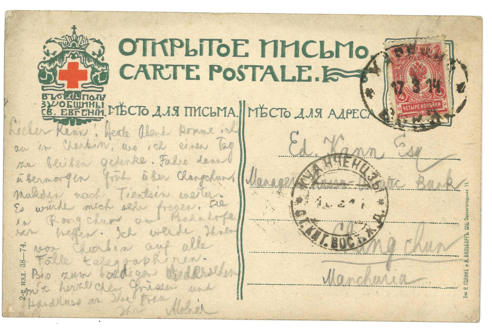 1914 Manchouli (24 Feb) to Russia. Picture postcard, f.w. Coat of Arms 3k, tied by Manchouli Town Russian PO T&S type 2b cds. Arrived Abiya (7 Mar).