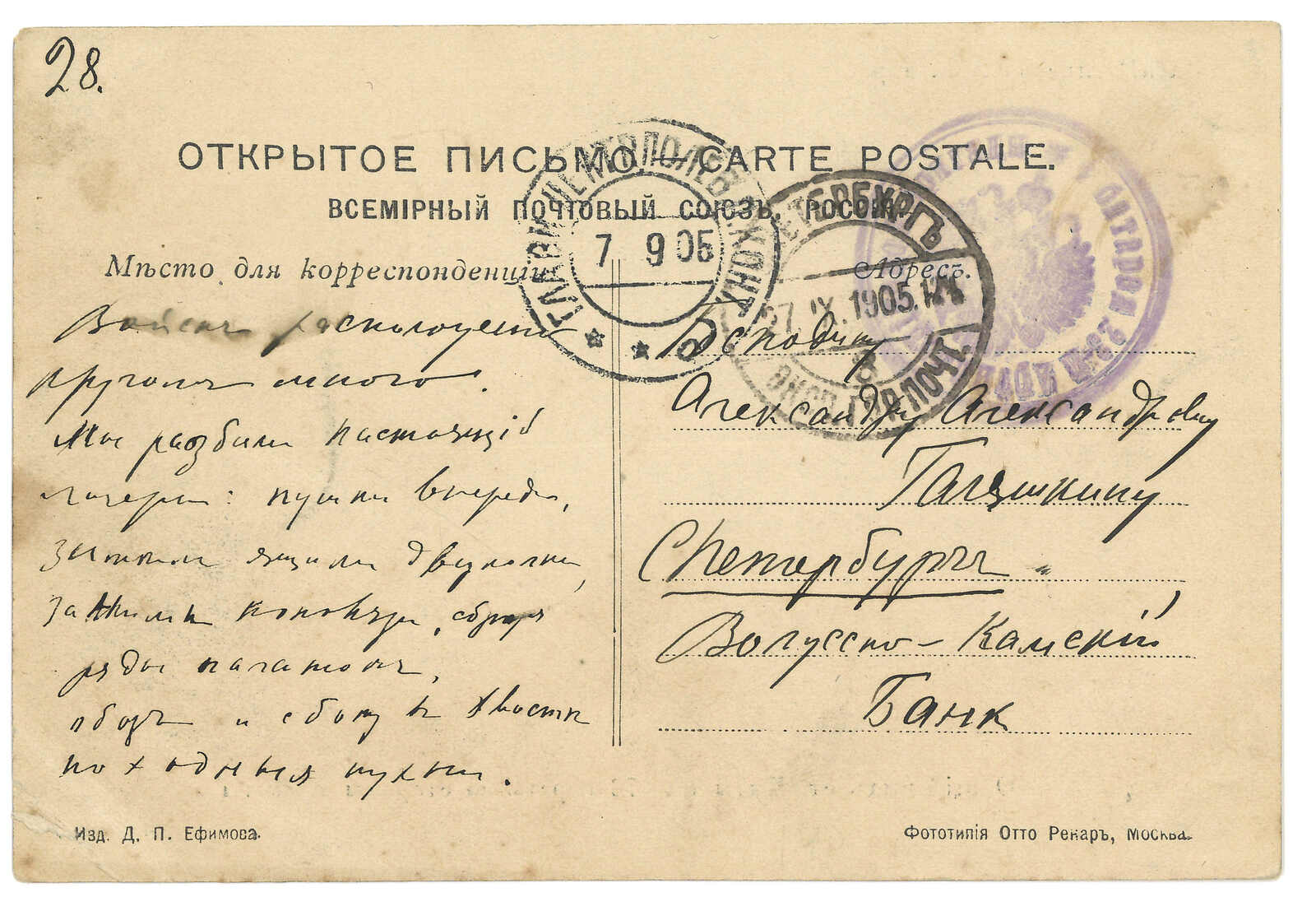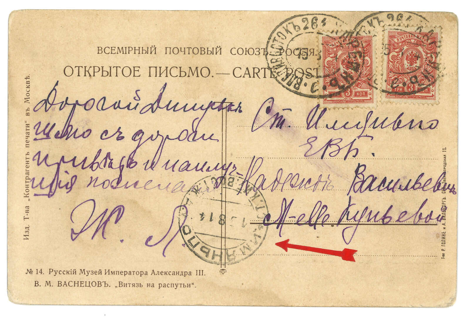 1910.1.15 俄國寄綏芬河。圖片明信片,貼軍徽圖1戈比 +