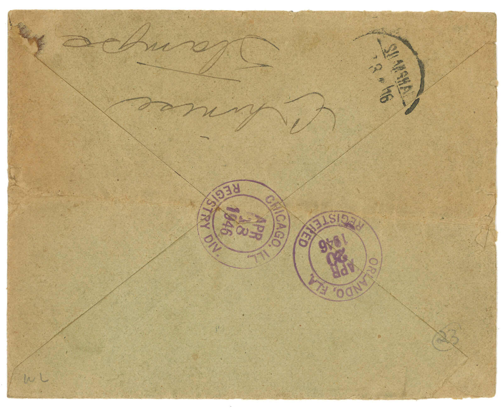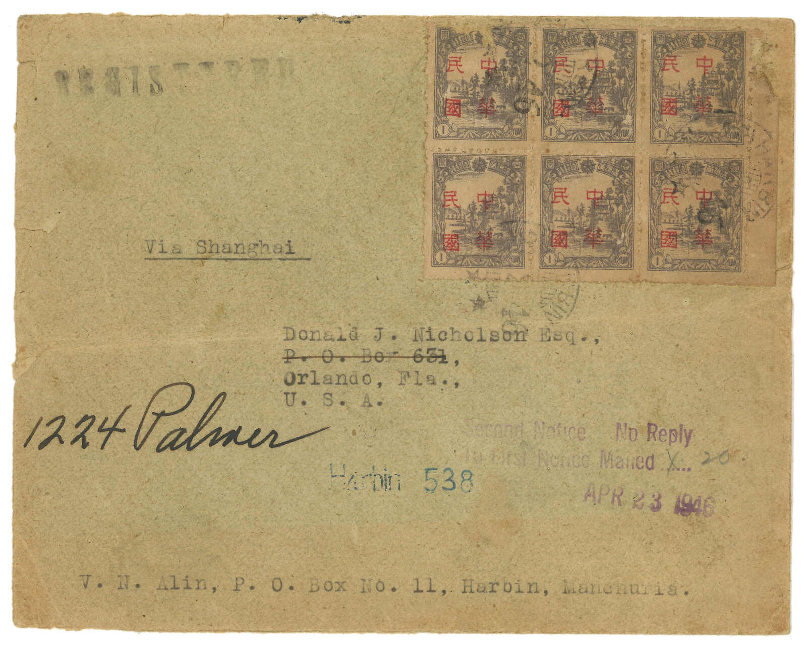1946.2 哈爾濱寄美國,貼滿洲國1元哈爾濱加蓋“中華民國”六方連,銷哈爾濱英文日戳。3月經上海。4.20抵美國。(Image 1)