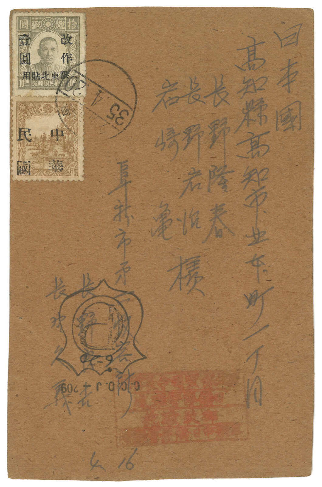 長春寄日本明信片,貼滿洲國3角錦州加蓋大字“中華民國” + 新民版孫像改值限東北貼用1元,銷長春日戳。(Image 1)