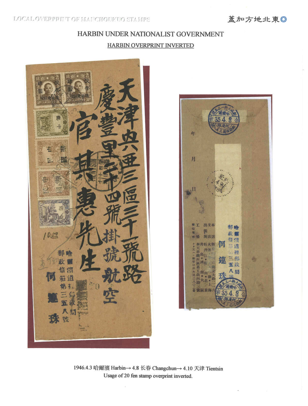 1946.4.3 哈爾濱寄天津,貼滿洲國加蓋中華民國及新民版孫像改值限東北貼用票共6枚,當中一枚2角帶加蓋倒蓋變異,銷哈爾濱日式日戳。4.10抵天津。(Image 1) (Image 2) (Image 3)