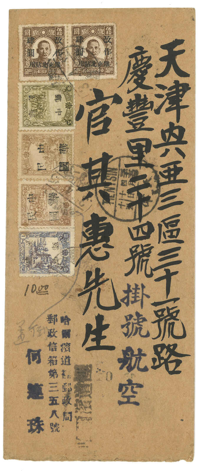 3276 cover image1946 Harbin (3 Apr) to Tientsin, f.w. Manchukuo ovpt. ROC and Sin Min Print SYS surch Limited For Use in Northeast issue x6, including one 20f stamp with inverted ovpt variety, tied by Harbin Japanese style cds. Arrived Tientsin (10 Apr).
