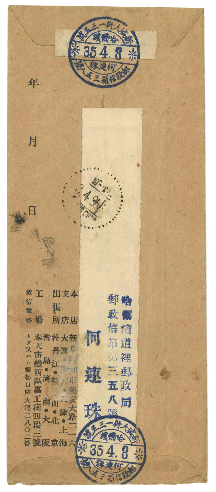 1946.6.3 怡大洋行掛號封,寄哈爾濱本埠,貼滿洲國票2角 + 3角加蓋“中華民國”(當中2角票加蓋倒蓋)+新民版孫像改值2元限東北貼用,銷哈爾濱英文日戳。另附郵件收條。哈爾濱於4月28日解放,但此封仍貼用滿洲國加蓋民國票。(Image 1) (Image 2)