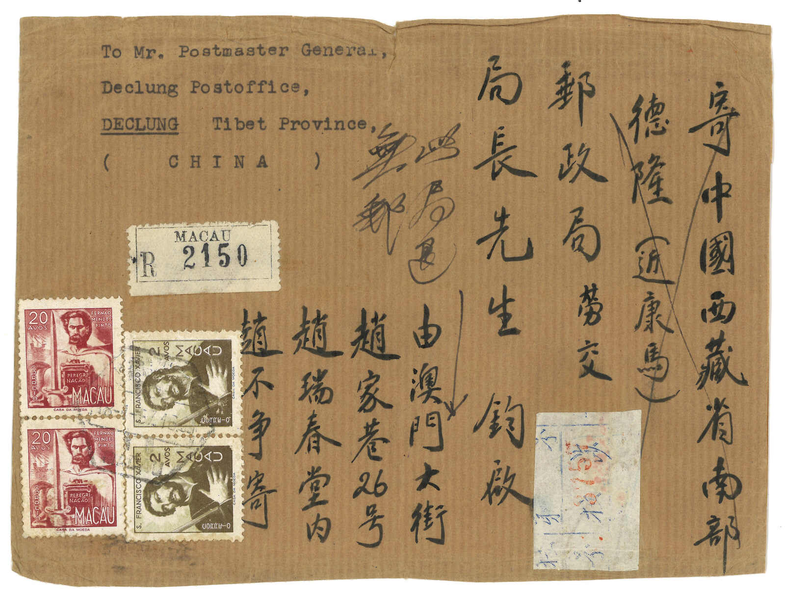 1245 cover image1957 Macao (18 Jan) to Postmaster General at Declung, returned to sender, f.w. Macao issues 2a in pair + 2a in pair, tied by Macao hexgonal d.s. Along with "This PO does not exist / return" annotation. With tear at top. Philatelic.