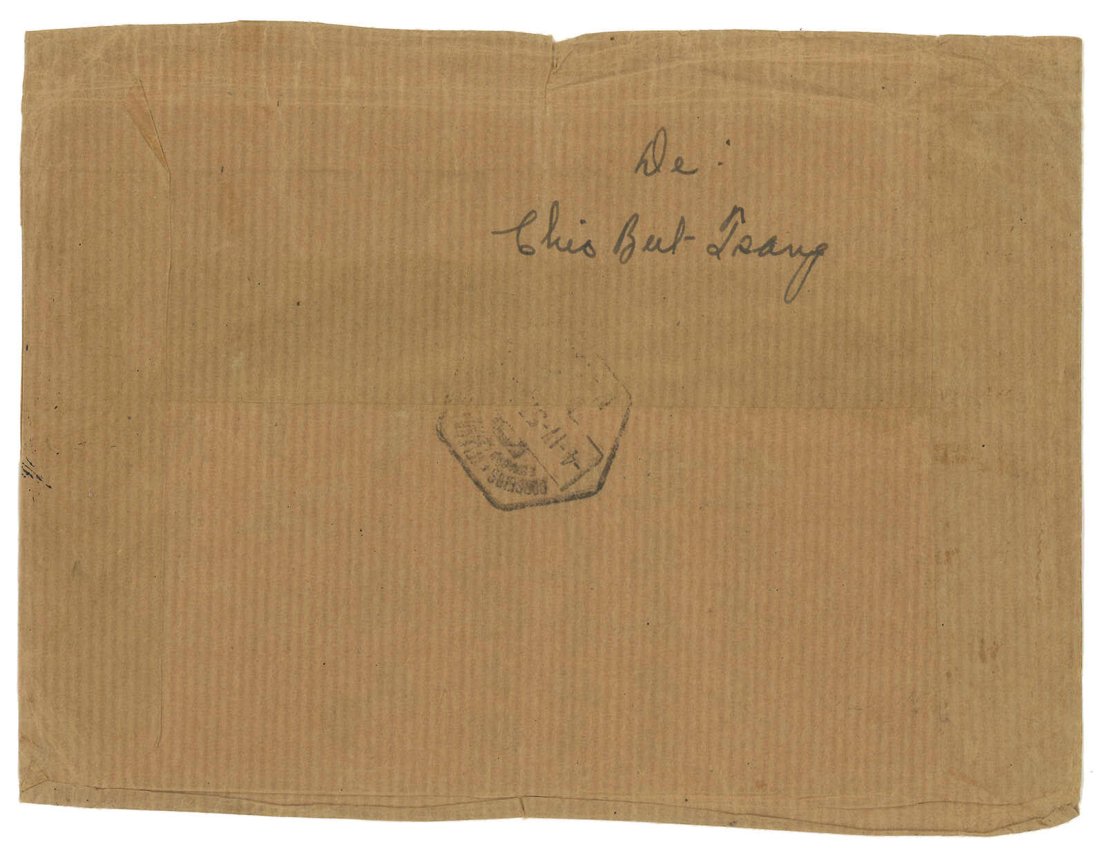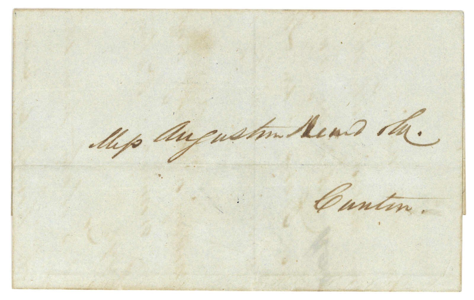1768 cover image1845 (Sep 19) outer wrapper from Hong Kong to Augustine Heard & Co, Canton. On the flap with oval “WESTERN LINE BOAT” forwarder postmark and ink brush-stroke delivery characters. Western Line Boat is a private mail service between Macao, Hong Kong and Canton. Choi Cheong Too recorded only 9 examples.
