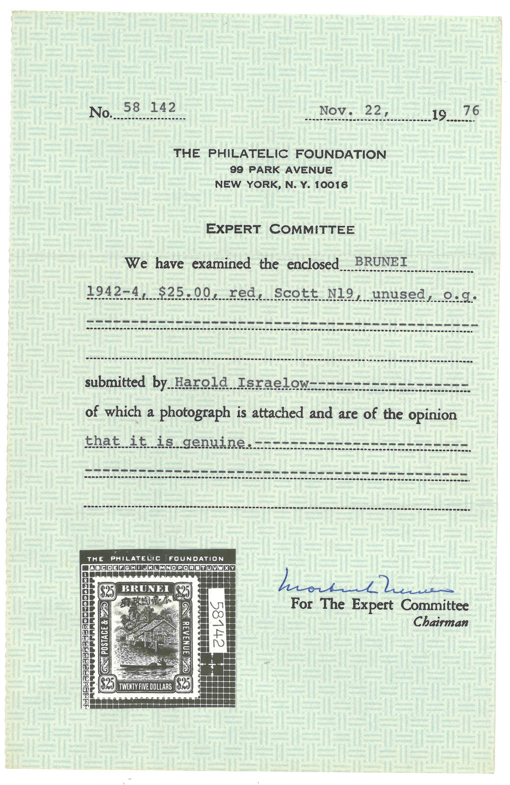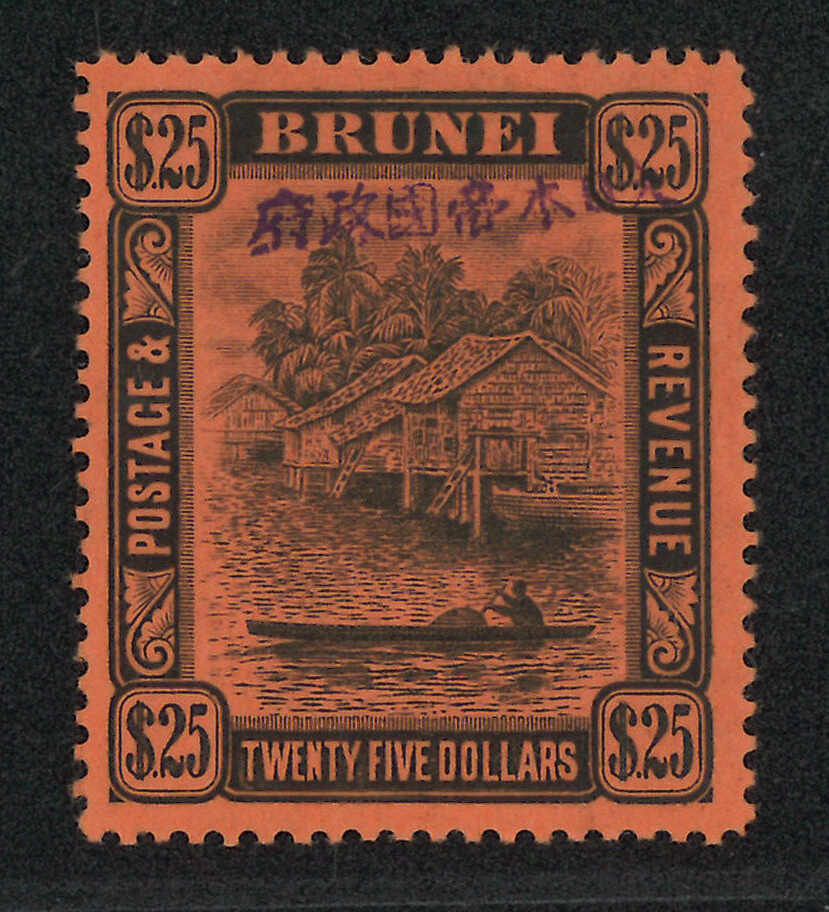 1944年汶萊手戳加蓋“大日本帝國政府”25元新,原膠輕貼。附證書。(Image 1) (Image 2) (Image 3)
