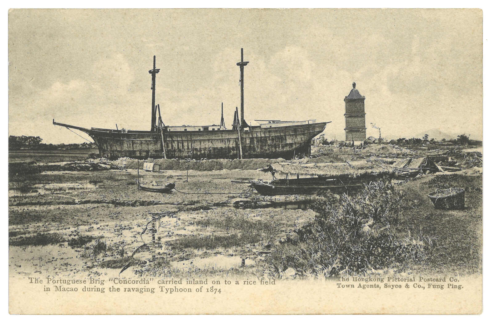 “澳門船隻Concordia於1874年澳門颱風後擱淺於稻田上”之圖片明信片,未使用。甲戌風災發生在1874年9月22日到23日。澳門約有5,000人死亡,以當年澳門人口約60,000人計,死亡人數之高,亦是澳門史上最多人死亡的風災。(Image 1) (Image 2)