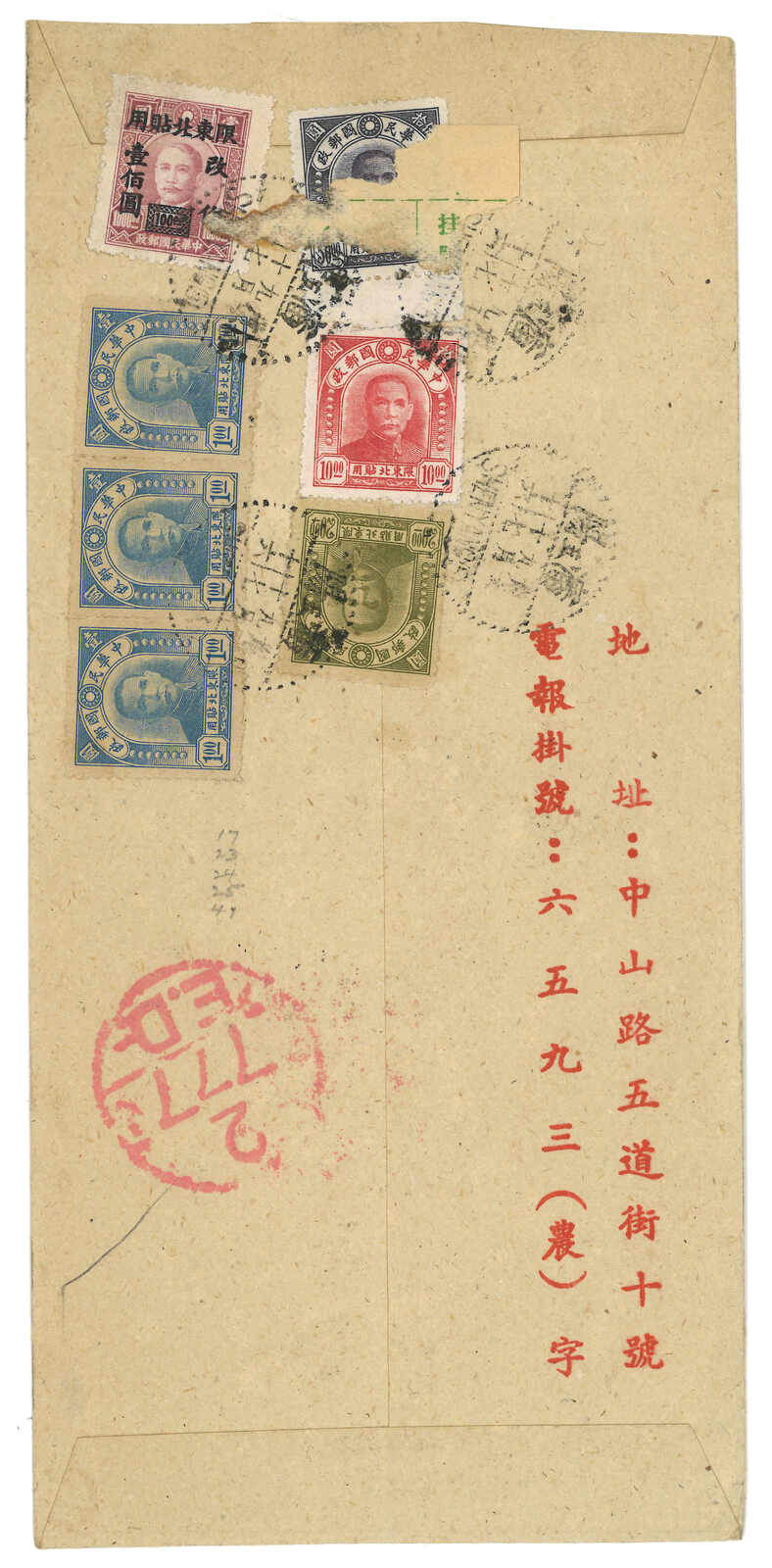 3294 cover image1947 Shenyang (17 Sep) to Shanghai. Airmail cover, f.w. Peiping Central 1st print SYS $1 in strip of 3 + $10 + $20 +$50 + SYS ovpt. Limited For Use in Northeast $100 on reverse, tied by Shenyang bilignual cds. Arrived Shanghai (21 Sep).