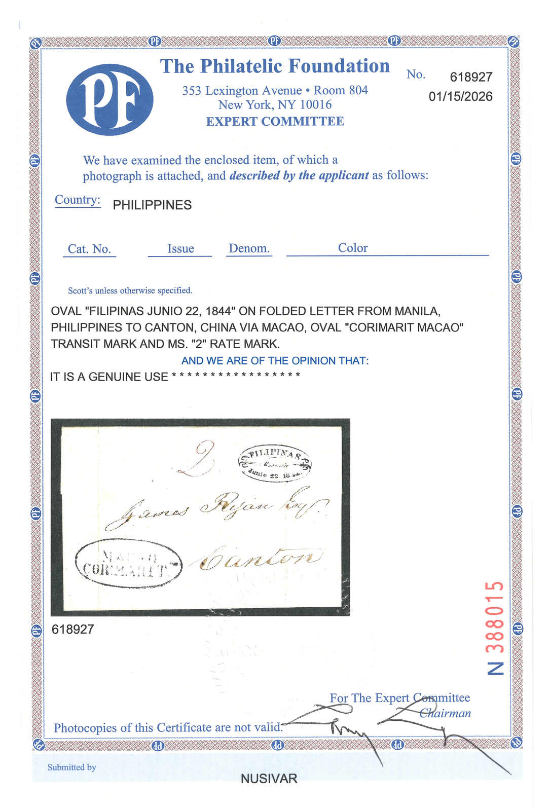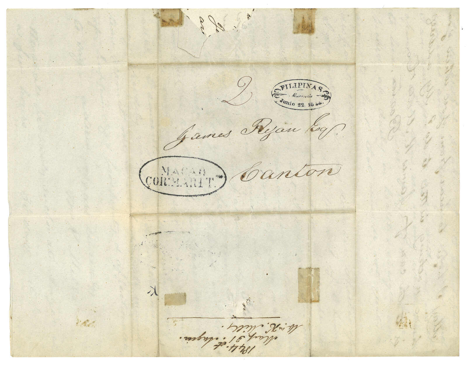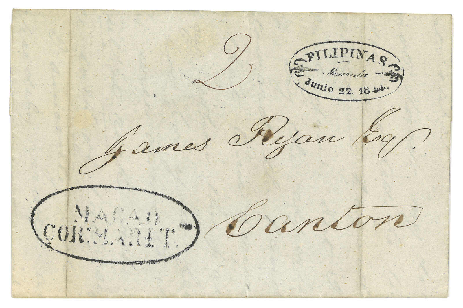 1844.6.22 馬尼拉經澳門寄廣州。郵簡,寫有郵資“2”,鈐“FILIPINAS / Manila”橢圓日戳及珍罕之“MACAO / CORoMARITmo”1-2-1型橢圓戳記。蔡昌道記錄,此戳僅見於15件封,而此例日期比蔡昌道之記錄(1842 年2月10日)更晚。難得。同為同時蓋有此菲律賓橢圓戳記之孤例。附證書。(Image 1) (Image 2) (Image 3) (Image 4) (Image 5) (Image 6)