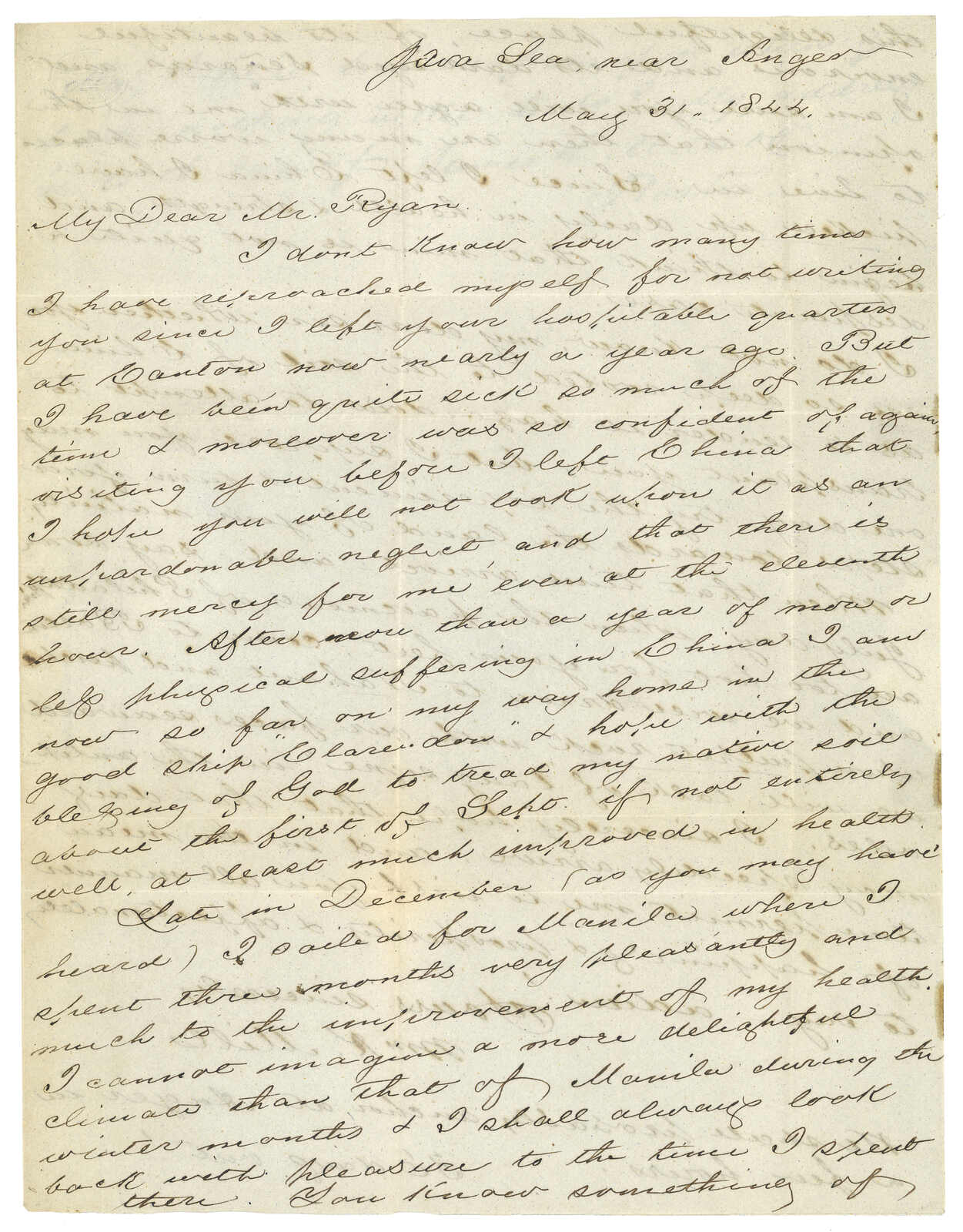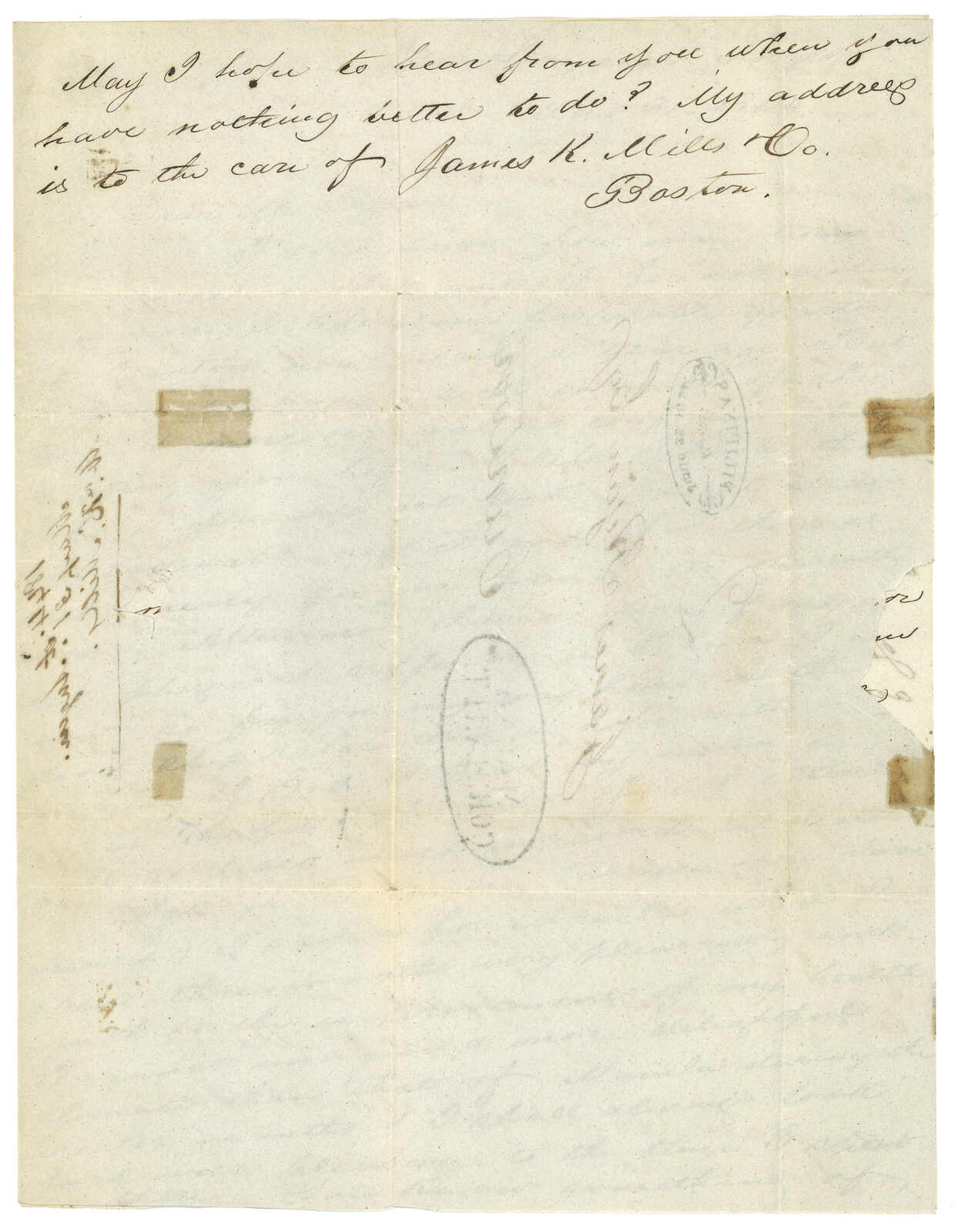 1847.8.7 由Russell Sturgis自馬尼拉經寄廣州旗昌洋行交Sammuel W Comstock。郵簡,寫有“via Pangasuran”字樣,鈐少見之1-4-2型“CORREIO MACAO MARITIMO”橢圓形戳記。蔡昌道“1916年至1891年澳門郵票發行前郵政史調查與紀錄”中之第589件封。鈐1-4-2型戳記之信件,蔡昌道記錄僅有十件。(Image 1) (Image 2) (Image 3) (Image 4)
