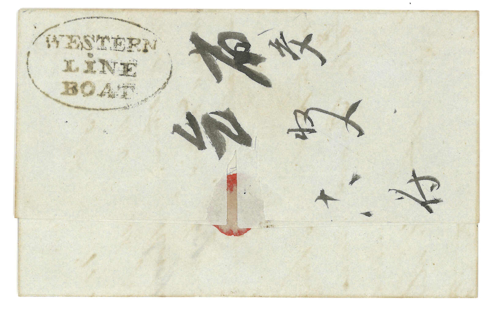 1845.9.19 郵簡封套,自香港寄廣州瓊記洋行。背面鈐橢圓形“WESTERN LINE BOAT”戳記及以毛筆書寫之“省交乞收入 / 十八付”送遞指示。Western Line Boat為往來港澳及廣州間之私人遞信服務。蔡昌道記錄中僅見九例。(Image 1) (Image 2) (Image 3)