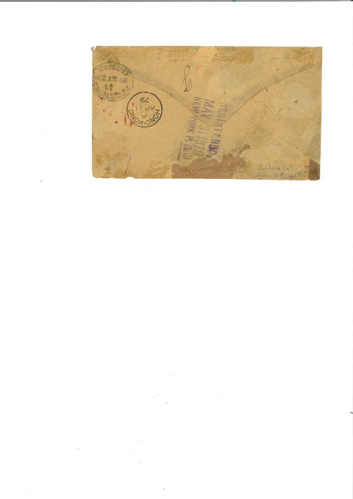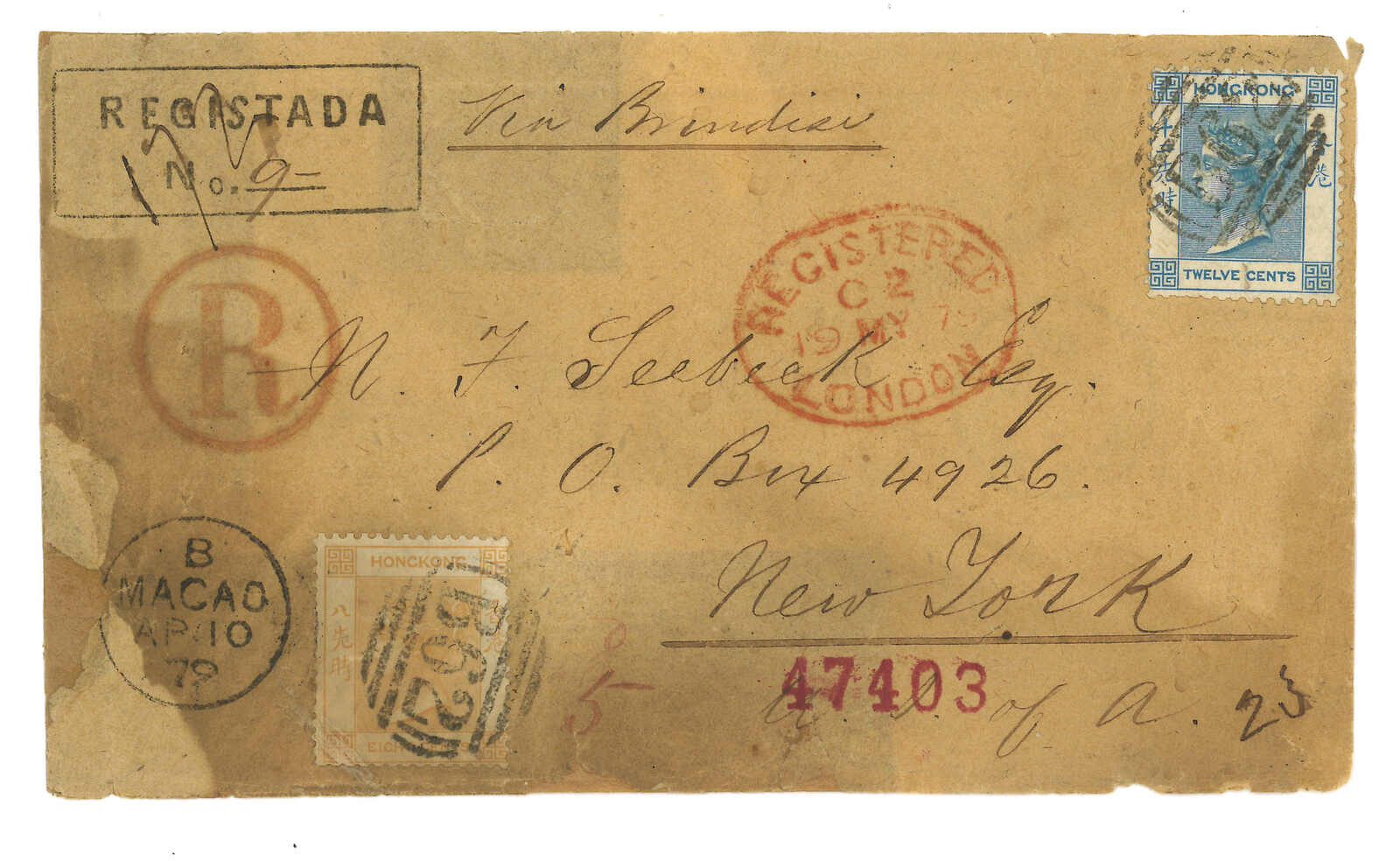 1879.4.10 澳門寄美國。掛號封,鈐澳門3-3-2型B字單圈日戳及“REGISTADA”帶框掛號章(手填號碼9)。加貼香港維多利亞女皇像12仙 + 8仙,銷B62殺手戳,另鈐香港4.11日戳。5.19經倫敦。5.31抵紐約。邊緣磨損,背帶粘痕。此為“REGISTADA”戳記之最早例子。而澳門3-3-2型日戳同樣少見,蔡昌道記錄僅十五件封片。F. Mayer舊藏。蔡昌道《1616至1891年郵票發行前郵政史調查與記錄》中第891號封。范笙祿著《澳門郵政與電訊的歷史和發行》第一卷第407頁圖172原件。附展頁。(Image 1) (Image 2) (Image 3)
